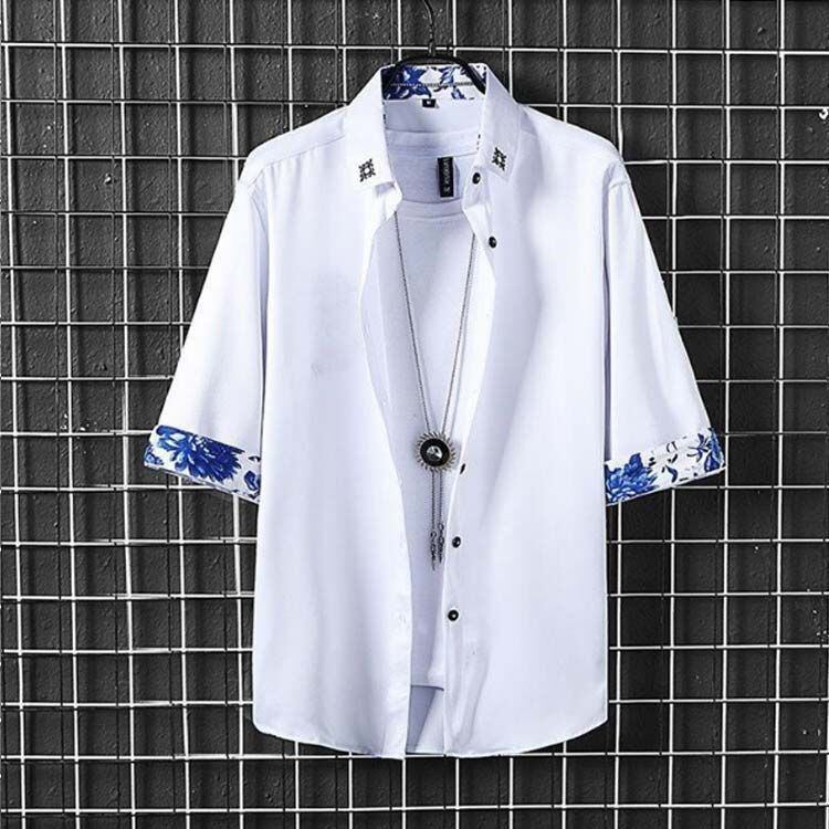 袖口と襟元に目を引く花柄をあしらった冷感素材の七分袖シャツ。