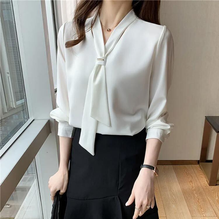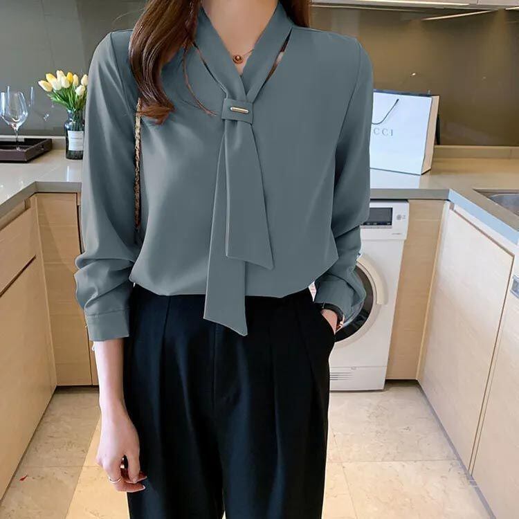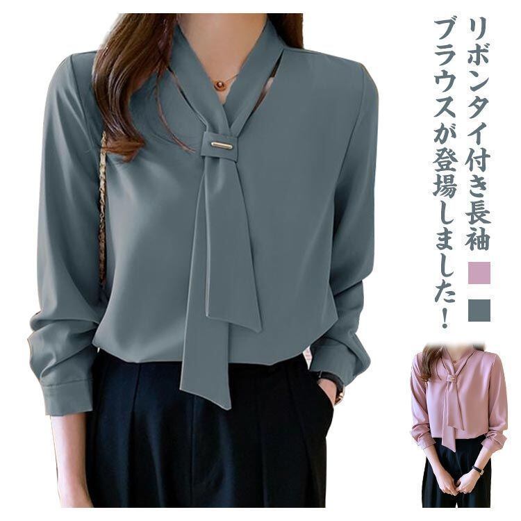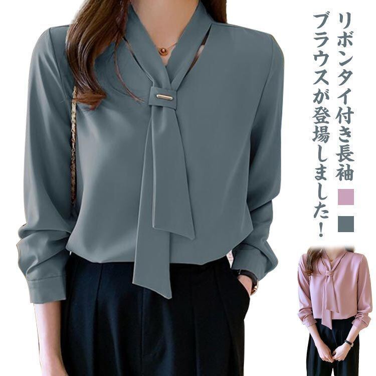 新品 3色展開 長袖 ブラウス ボウタイ レディース シャツ リボン トップス オフィス 秋 春 大きいサイズ パフスリーブ Vネック 落ち感 魅力 お洒落 無地 エレガント 通勤 デート お出掛 kkkbnz
