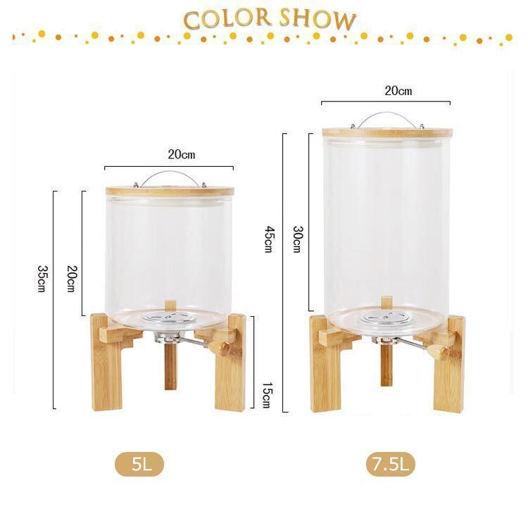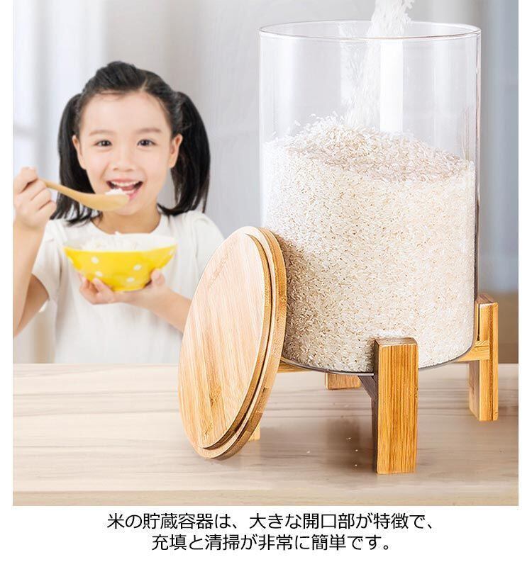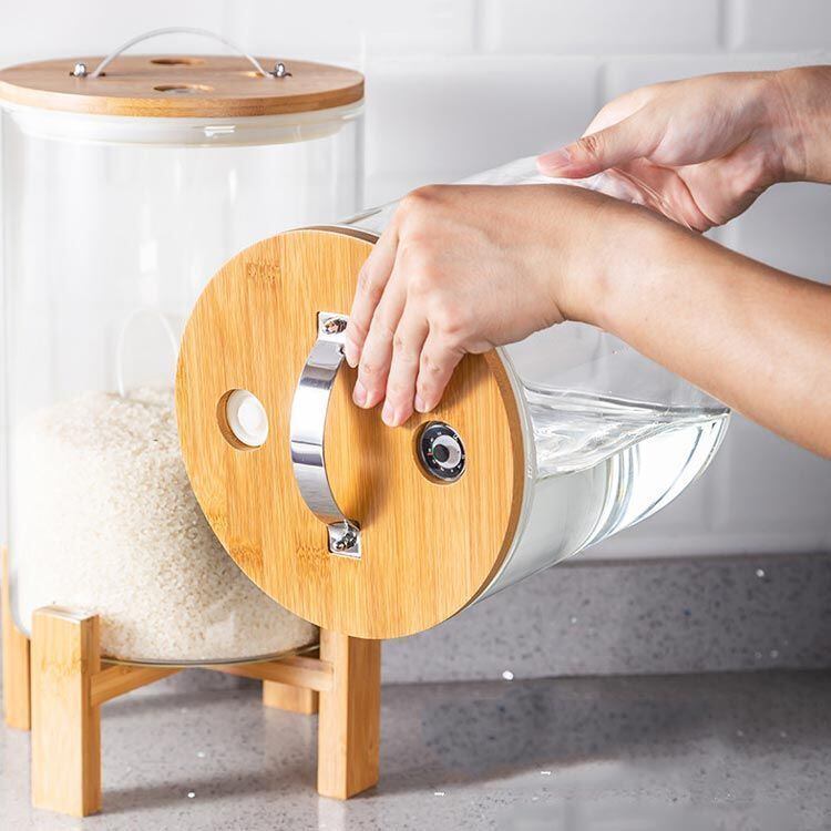 竹製のスタンドが付いた密閉ガラス米びつ。