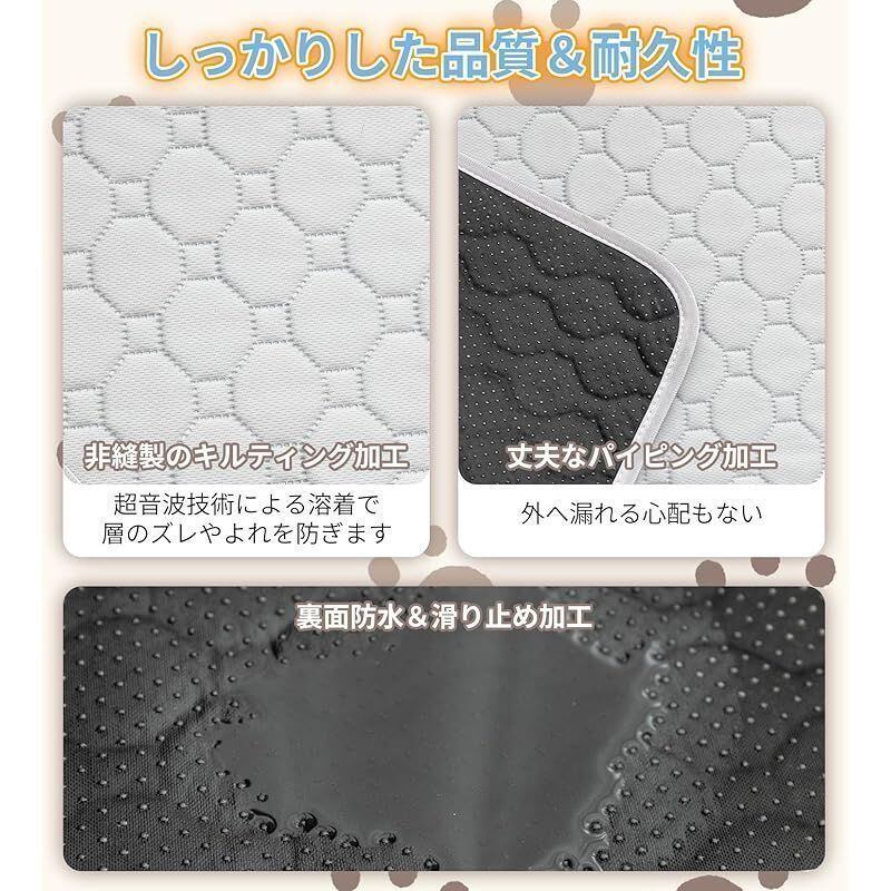 【超吸収&漏れ防止】超吸収洗えるペットシーツ!おしっこパッドはしなやかで柔らかい肌触りと吸水・速乾性を兼ね備える高品質の生地を厳選しております。四重構造に設計されて、おしっこを素早く吸収・拡散し裏には水分を通さない!雑菌の繁殖を防ぎ、高い通気性及び快適性を実現しています。エコペットシーツは滑り止め裏地で、あちこちにも移動しません。防水シートでおしっこをキープするので床に漏らしません。 底面は滑り止め加工がされているので、滑って周りが汚れることもありません。