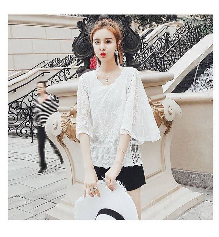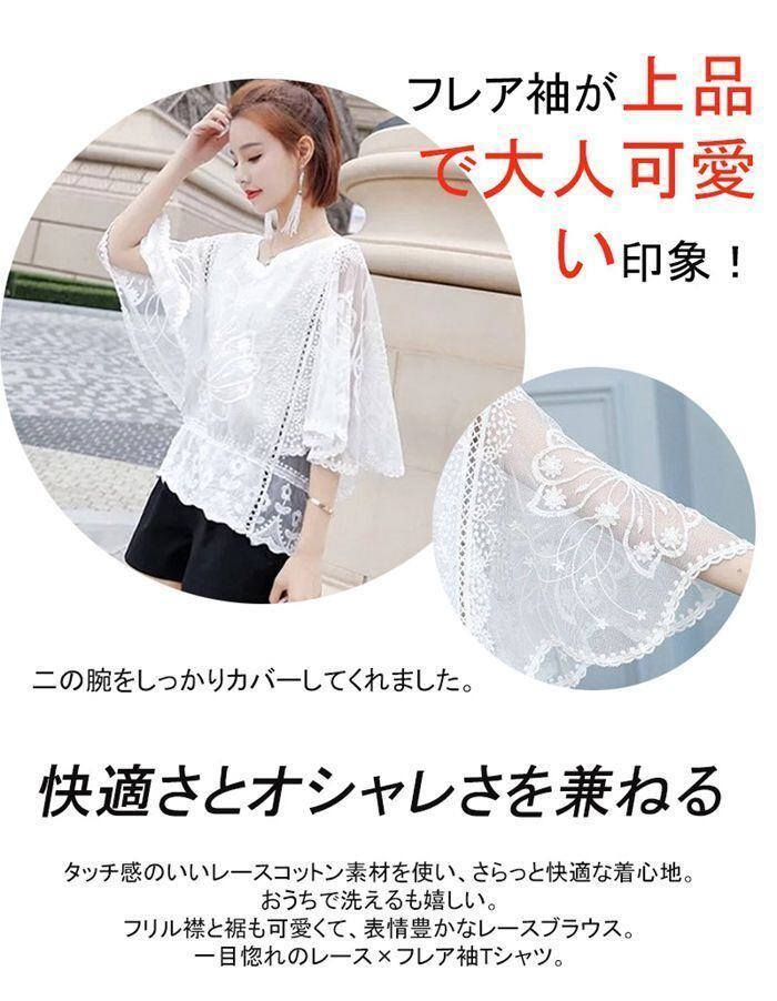 新品 ブラウス トップス レディース フレア袖 フレアスリーブ 七分袖 五分袖 カットソー 花柄 レース 刺繍 綿 コットン ドルマンスリーブ tシャツ Tシャツ プルオーバー フリル 春夏 大人可愛い おしゃれ きれいめ kkklgd