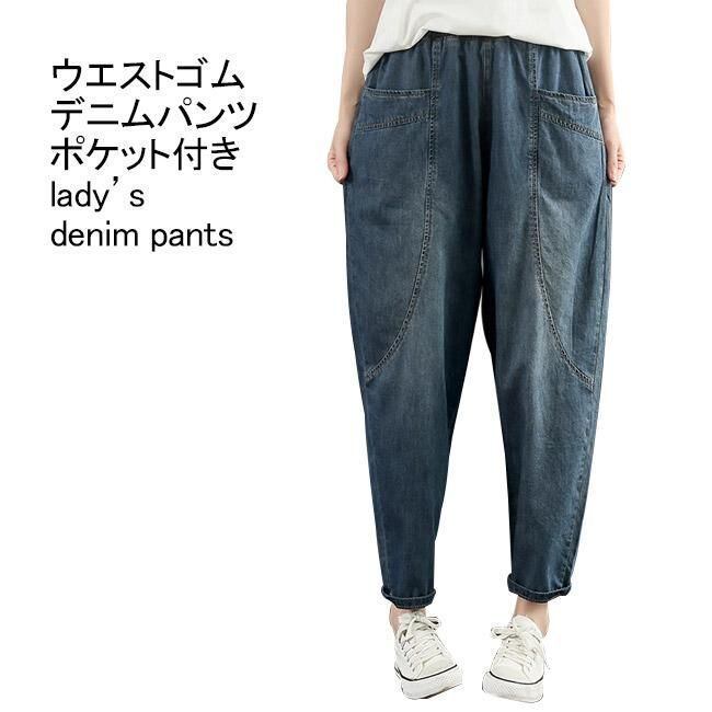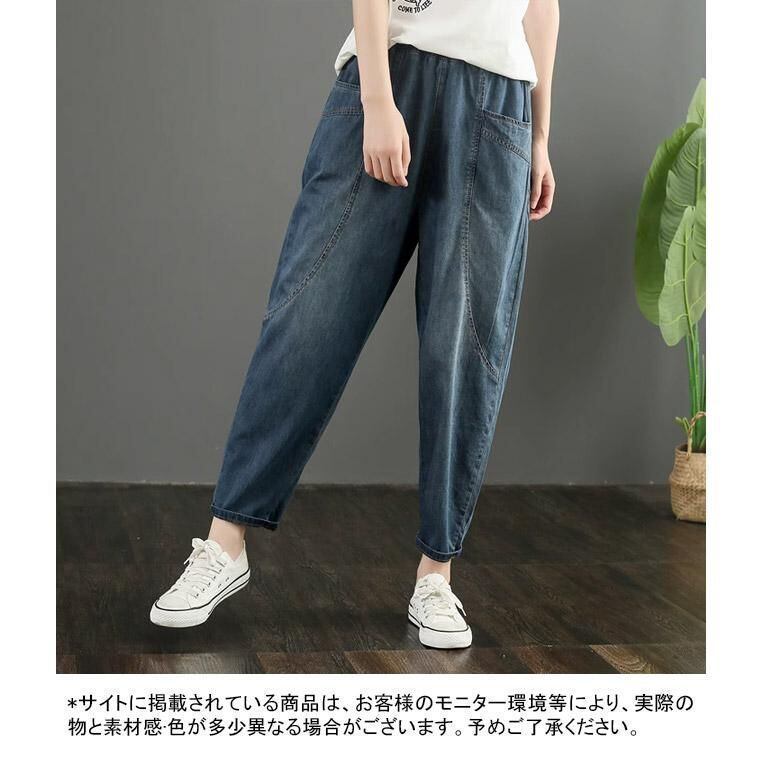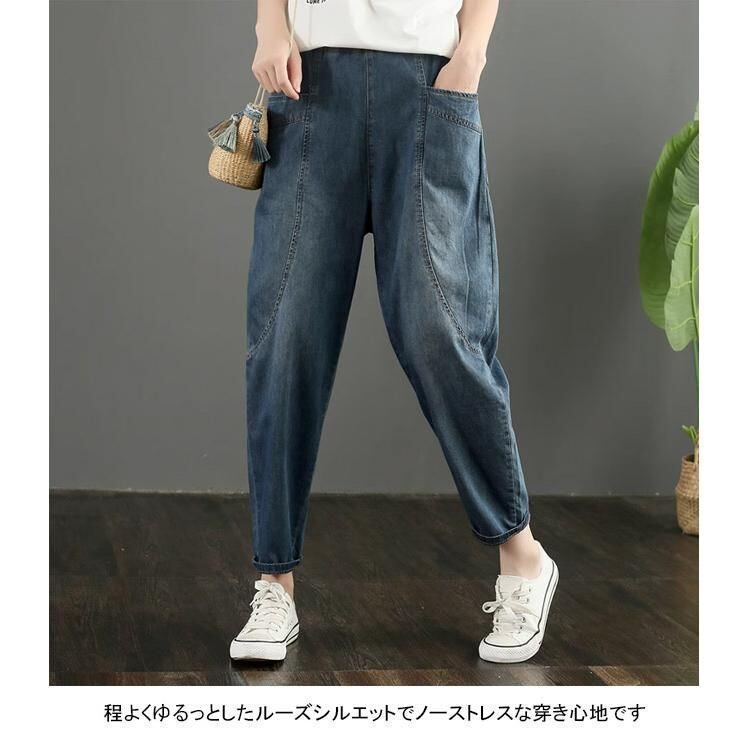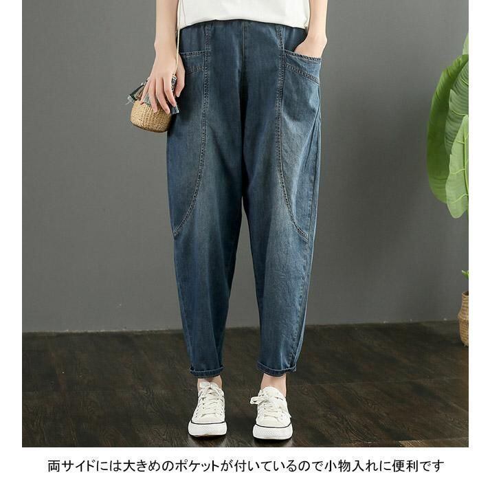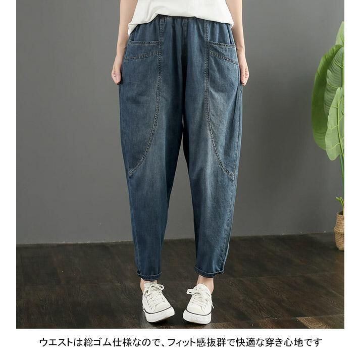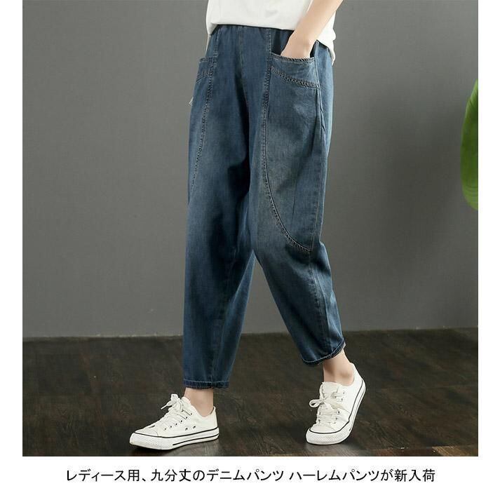 デニムパンツ レディース ロングパンツ 無地 九分丈 薄手 ポケット付き ウエストゴム ハイウエスト 柔らかい 合わせやすい ゆったり 体型カバー シンプル カジュアル 美脚 春夏秋 ボトムス 長ズボン ジーンズ ハーレムパンツ