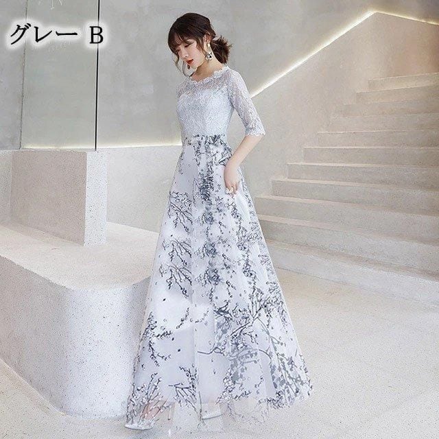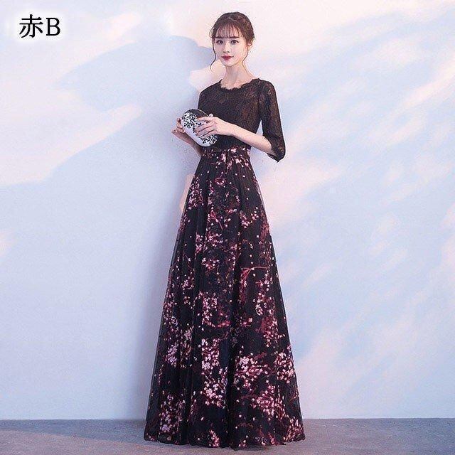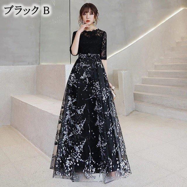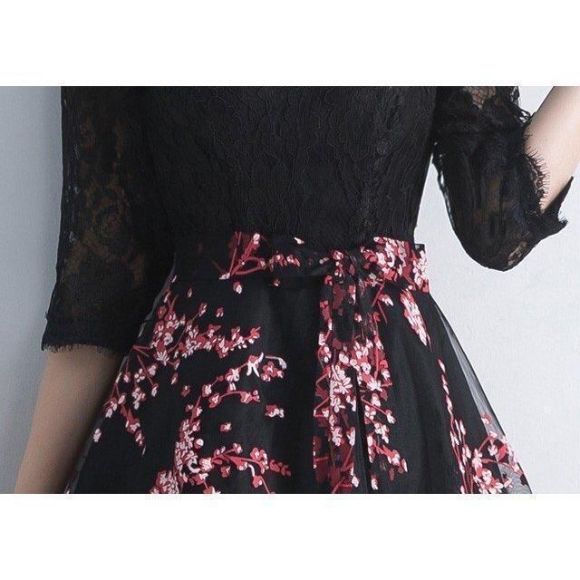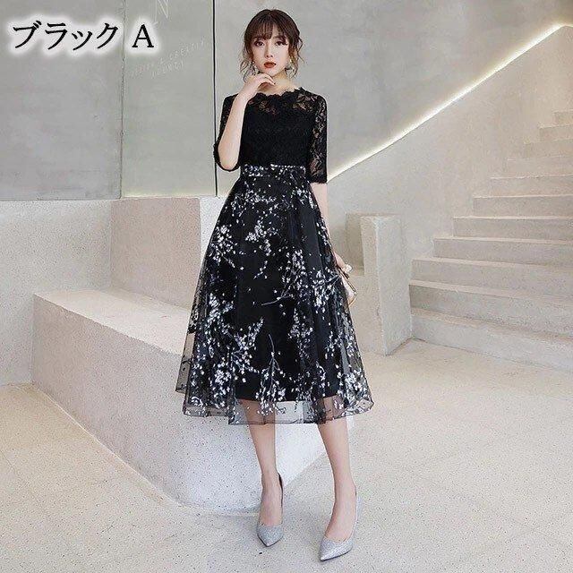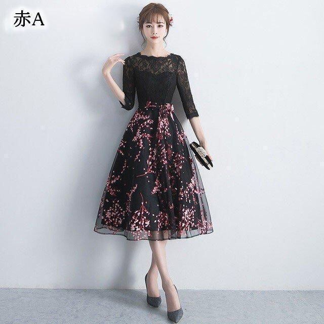 新品 ドレス プリント お洒落 黒 パーティードレス ミモレ丈 レース 二次会 お呼ばれドレス 5分袖 Aライン イブニングドレス 30代 40代 発表会 kkkoge