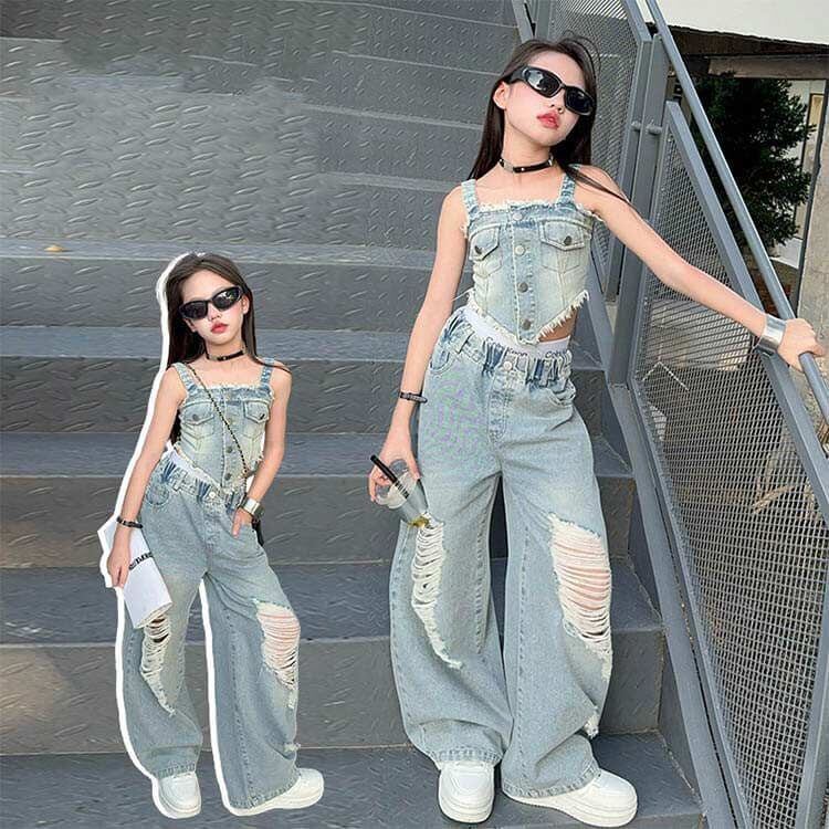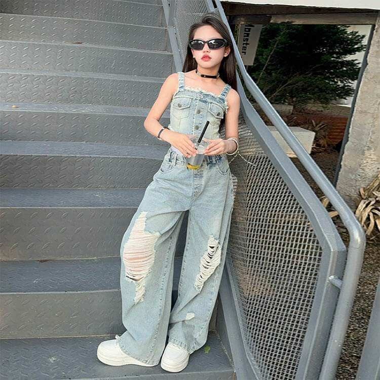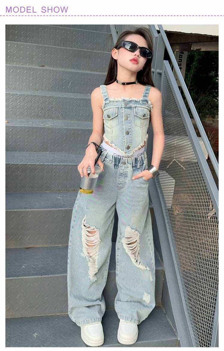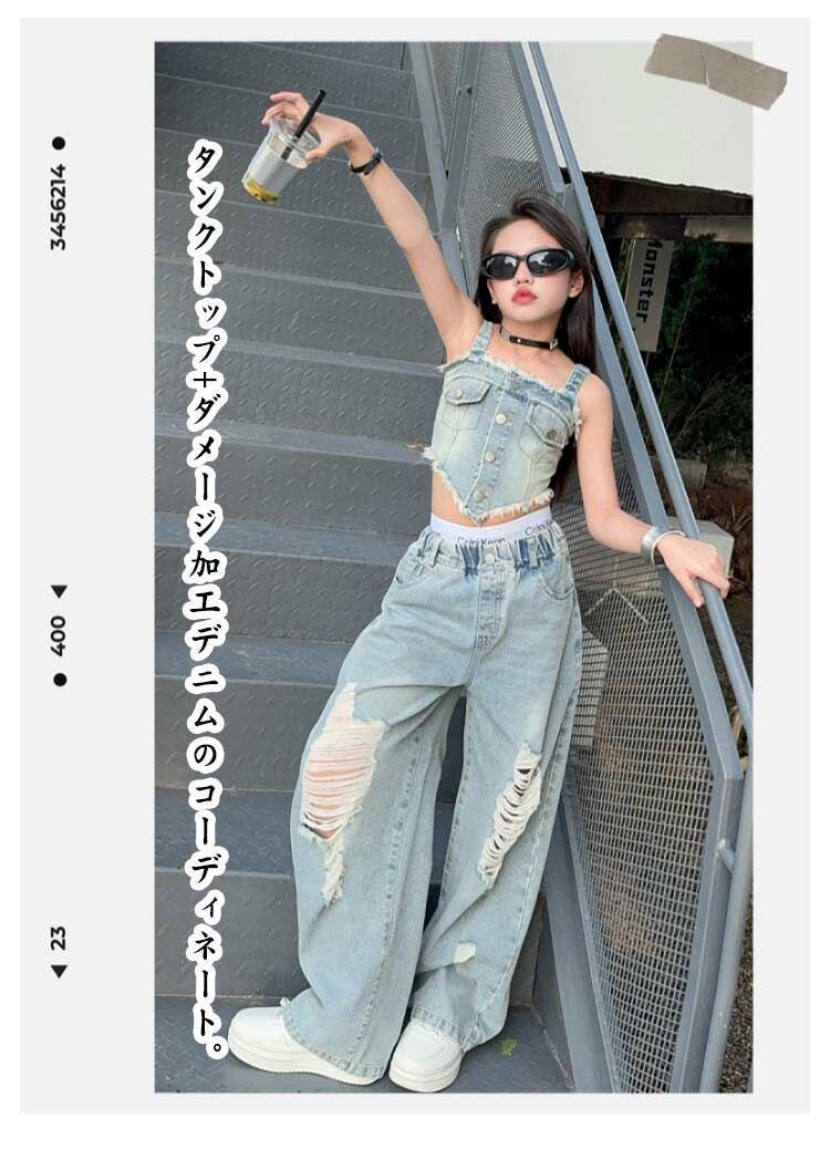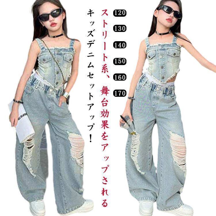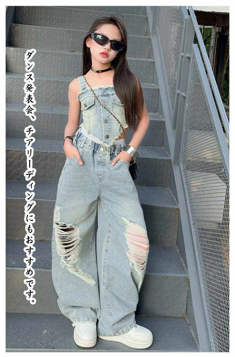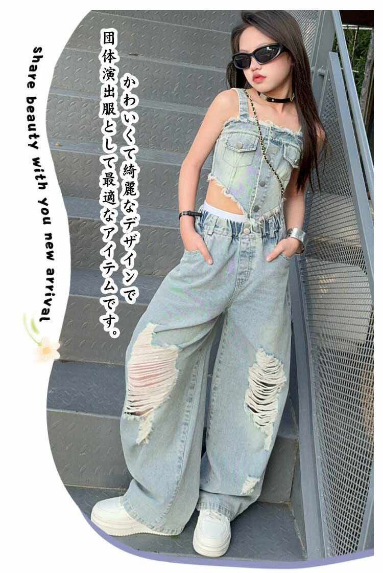 新品 デニム セットアップ キッズ ジャズダンス衣装 子供服 夏 ジャズダンス 衣装 k-pop キャミソール 韓国 女の子 ダメージ デニムパンツ ヒップホップ ポッピング チアガール 発表会 演出服 応 kkkeqi