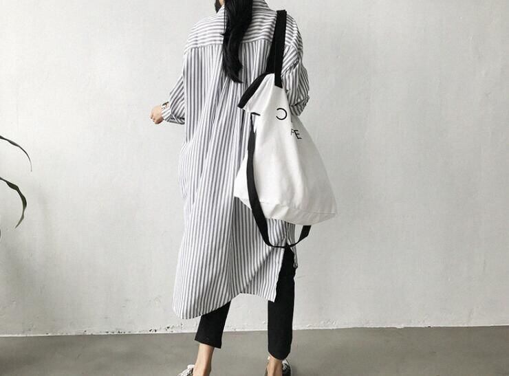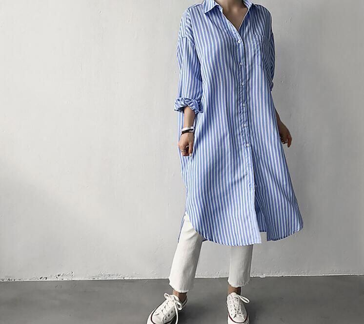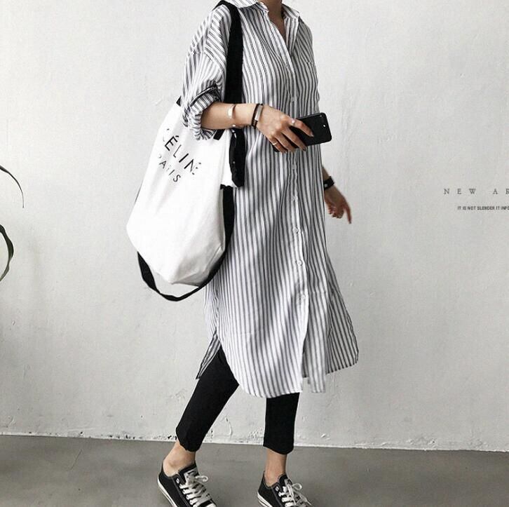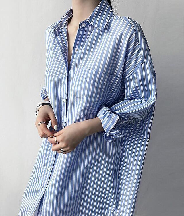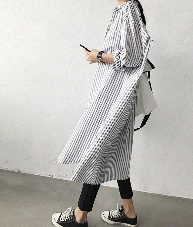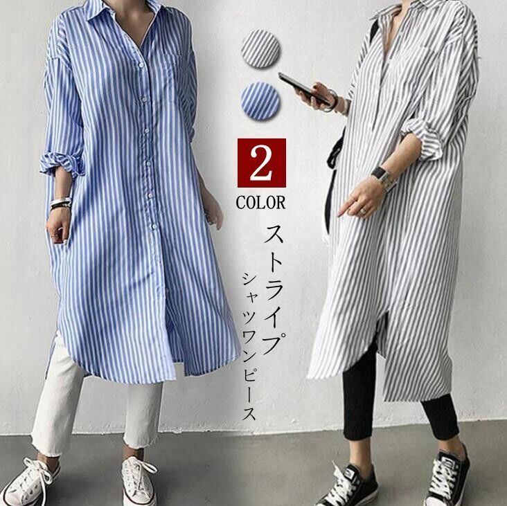 新品 シャツワンピース ロングシャツ ワンピース ミディアム丈 長袖 シャツ レディース スリット入り チュニック ストライプ シャツワンピ 2色 春夏 kkkfno
