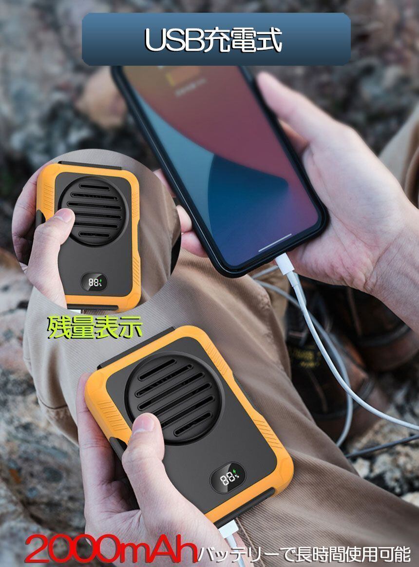 【2000mAh \u0026 USB充電式】 2000mAh大容量リチウムポリマー電池を採用して、フル充電完了後、1段階目の自然風で約8時間使用できます。腰掛けファンはUSB充電式タイプです。