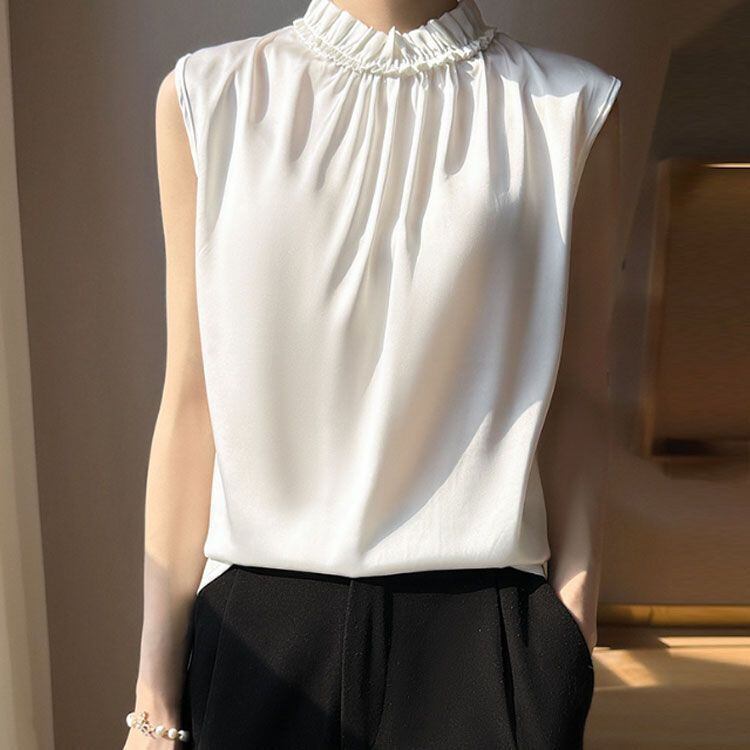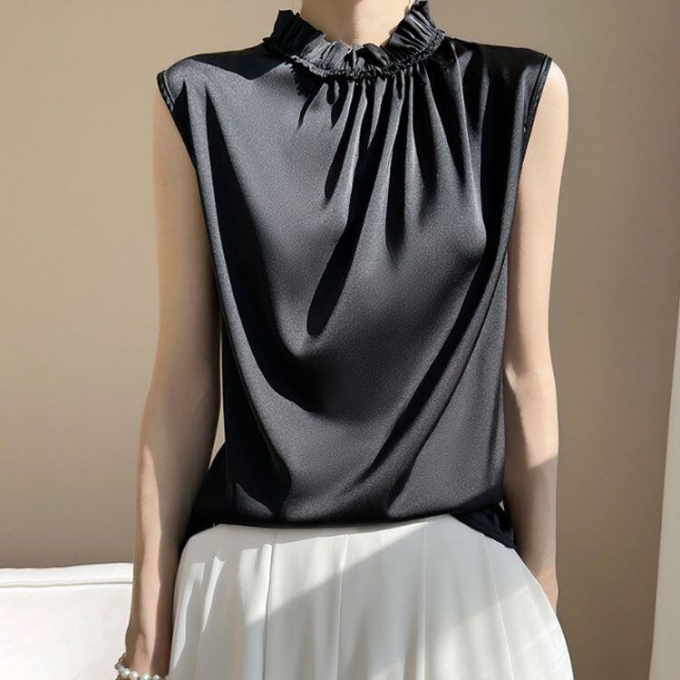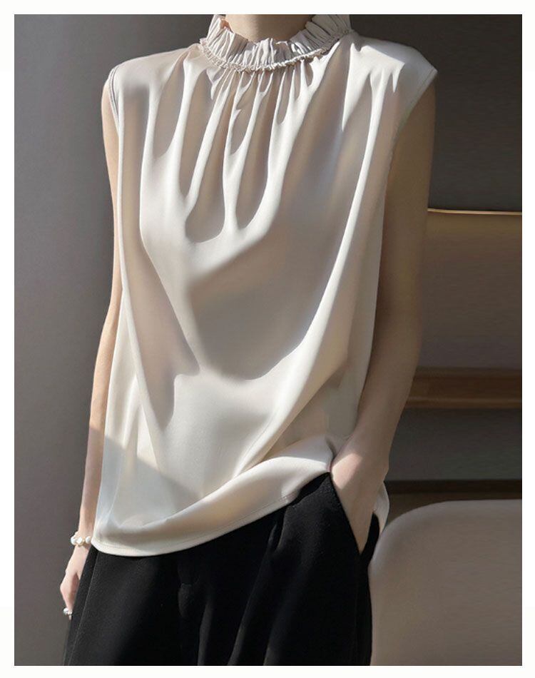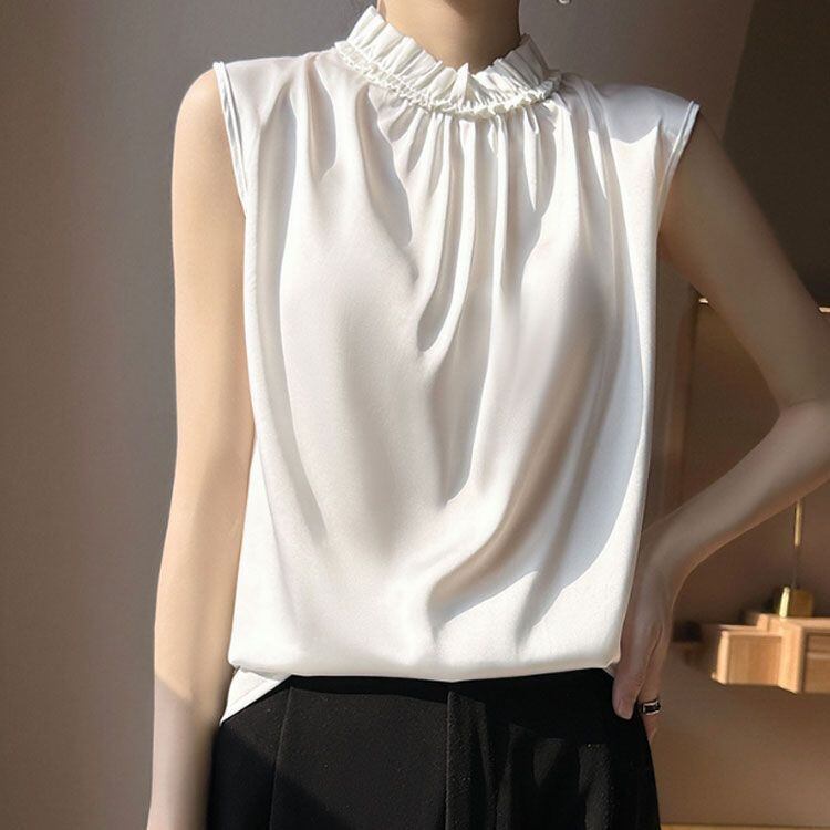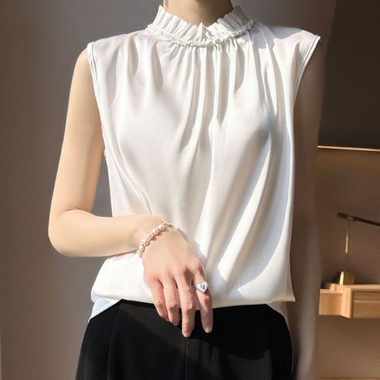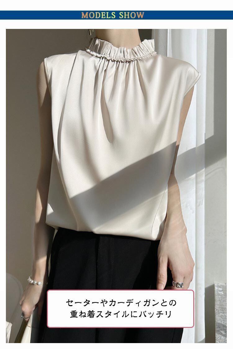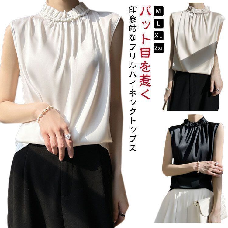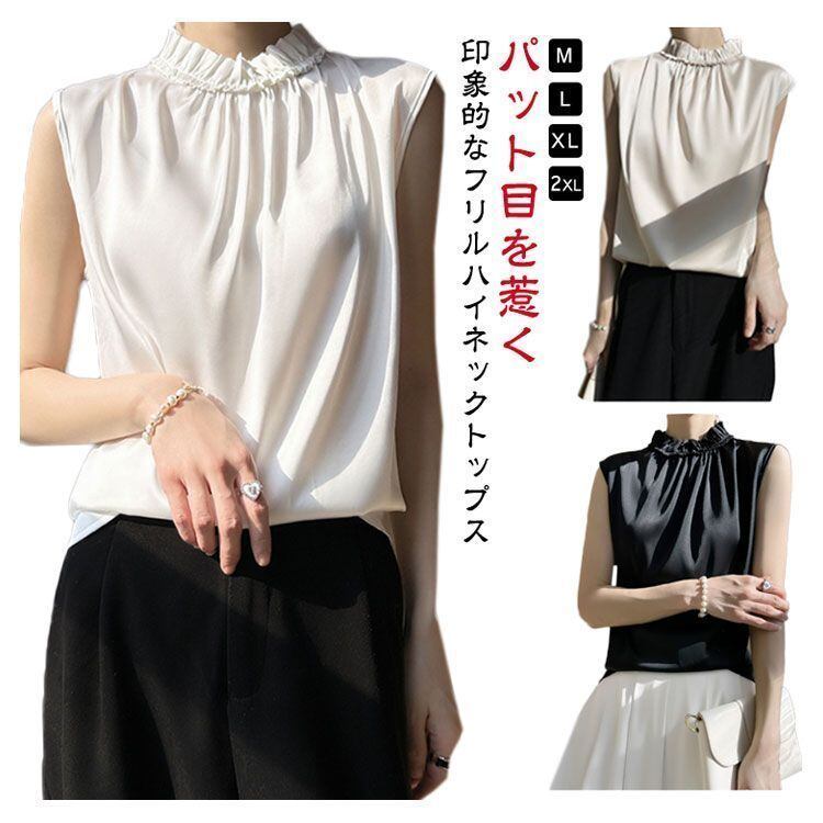 新品 OL サテンtシャツ サテン サテン ハイネックブラウス オフィス 可愛い フレンチスリーブ ノースリーブ キレイめ 光沢感 トップス フリル エレガント 大きサイズ tシャツ 女性 kkkjhg