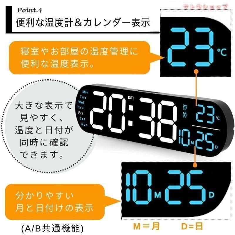 \u003c!-- description --\u003e【人気の大型LEDディスプレイで時刻表示がわかりやすい】\u003cbr\u003eLEDの大型ディスプレイの視認性の良さを追求したシンプルで洗練されたデザイン。\u003cbr\u003e時刻や日付合わせ、明るさ調整はリモコンで簡単調整。\u003cbr\u003ePDF説明書付き。(ウェブ上でPDF説明書をご覧下さい)\u003cbr\u003e【リモコン付きで操作も簡単、明るさは10段階調節可能】\u003cbr\u003eリモコン付きで、時刻合わせ、アラーム、ストップウォッチ、12・24時間表記の選択、万年カレンダー、文字盤の明るさは10段階調節可能。\u003cbr\u003eシンプル操作で使い方も簡単。\u003cbr\u003e【情報が一目でわかる!便利な温度計、カレンダー表示】\u003cbr\u003e寝室やお部屋の温度に気を配るあなたにおすすめの便利な温度計機能付き。\u003cbr\u003e【便利なタイマー、ストップウォッチ機能付き】\u003cbr\u003e料理や、運動、勉強に。便利なタイマー、ストップウォッチ機能が活躍します。\u003cbr\u003eリモコン操作で離れた場所からでも操作が可能。\u003cbr\u003e【配線は上下左右、自由自在、時刻メモリ機能】\u003cbr\u003e配線の位置は上下左右、お好きな方向で設置可能。\u003cbr\u003e※充電式ではありません。必ず付属のUSBケーブルで電源を確保してください。変換アダプターはご用意ください。\u003cbr\u003e\u003cbr\u003eUSB\u003c!-- /description --\u003e