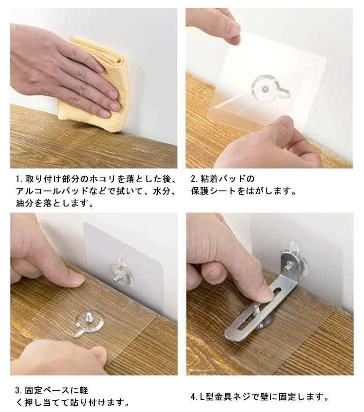 家具類と壁面をネジや金具を使用した従来の方式ではなく、剥離紙をめくり貼り付けるだけで簡単に設置できる画期的な家具転倒防止器具です。