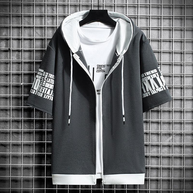 パーカー 切り替え 半袖パーカー ジップアップ メンズ パーカ トップス プリント 肌触り フード付き 半袖 文字 運動着 部屋着 ルームウェア スポーツウェア メンズファッション zuoyte49