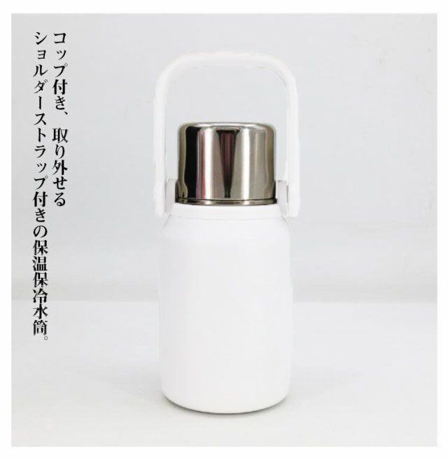 コップ付き、取り外せるショルダーストラップ付きの保温保冷水筒。