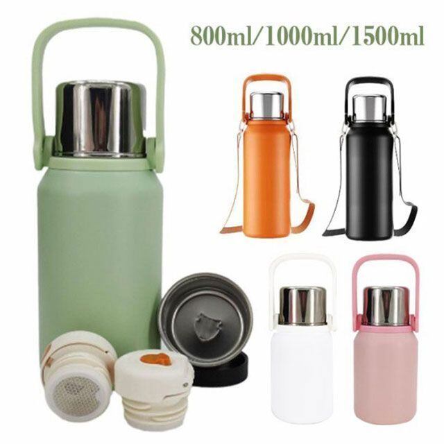 新品 水筒 大容量 800ml 1L 1.5L 保温 保冷 マグボトル コップ付き キッズ 大人 真空断熱 ボトル 魔法瓶 軽い 持ち手 ストラップ 付き 茶こし付き 軽量 おしゃれ 真空ボトル ステンレス kkkhlx