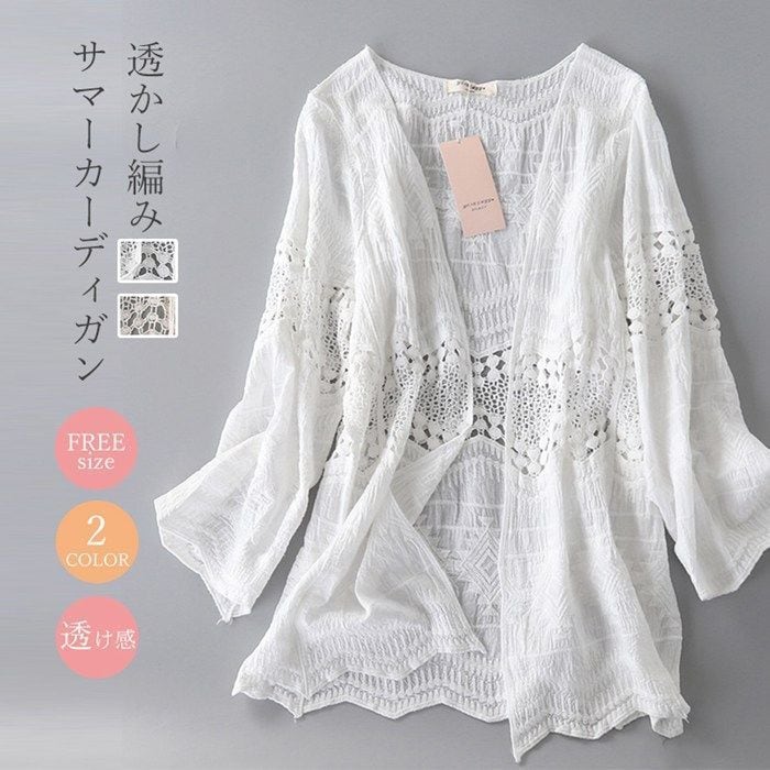 新品 カーディガン サマー カーディガン レディース 夏 アウター 春 涼やか 透かし編み 細魅せ 美人 夏物 夏服 薄手 ゆったり 長袖 ホワイト 白 ベージュ 冷房対策 紫外線対策 旅行 kkkhcx