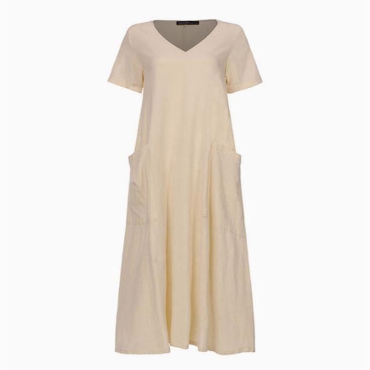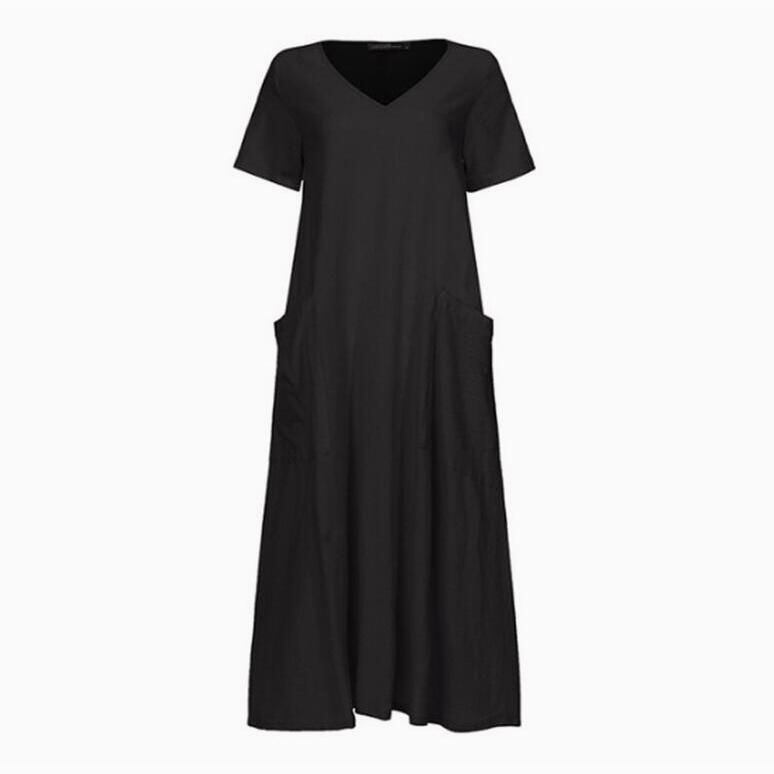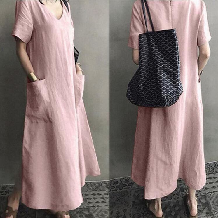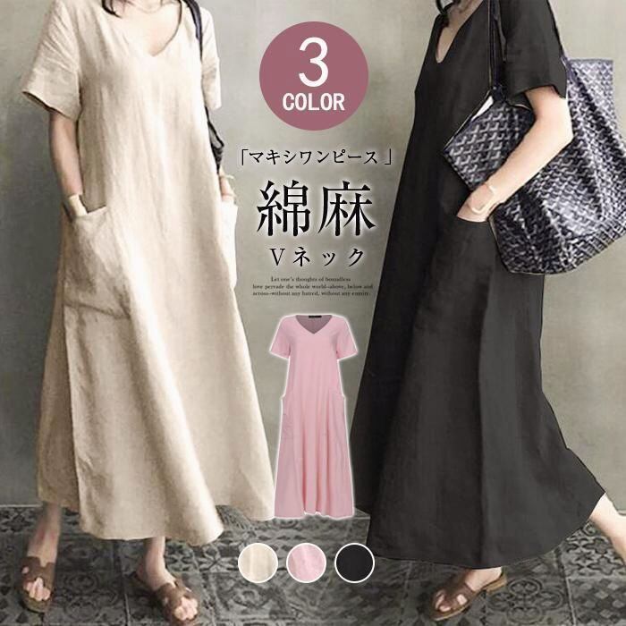 新品 マキシワンピース レティース 半袖 無地 ワンピース Vネック ゆったり 綿麻ワンピース 体型カバー 夏物 ロングワンピース シンプル kkkpxe