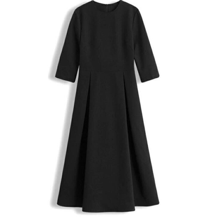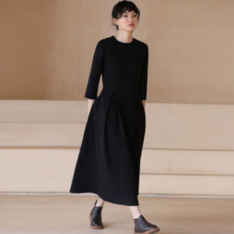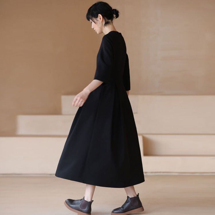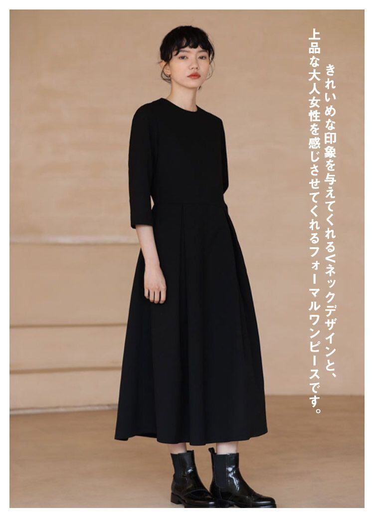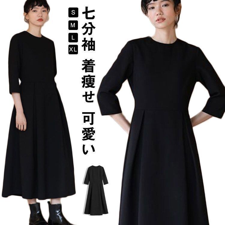 新品 ブラックフォーマル ワンピース ロングワンピース フォーマル 黒 七分袖 レディース ラウンドネック Aライン ブラックドレス 大人 着痩せ 可愛い パーティー 冠婚葬祭 二次会 演奏会 上品 礼服 kkkfom