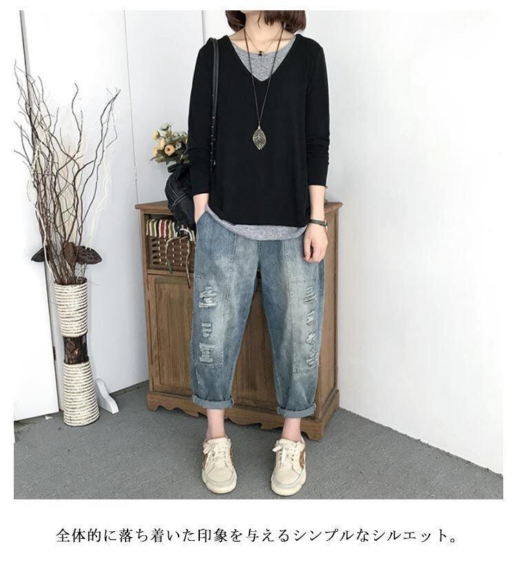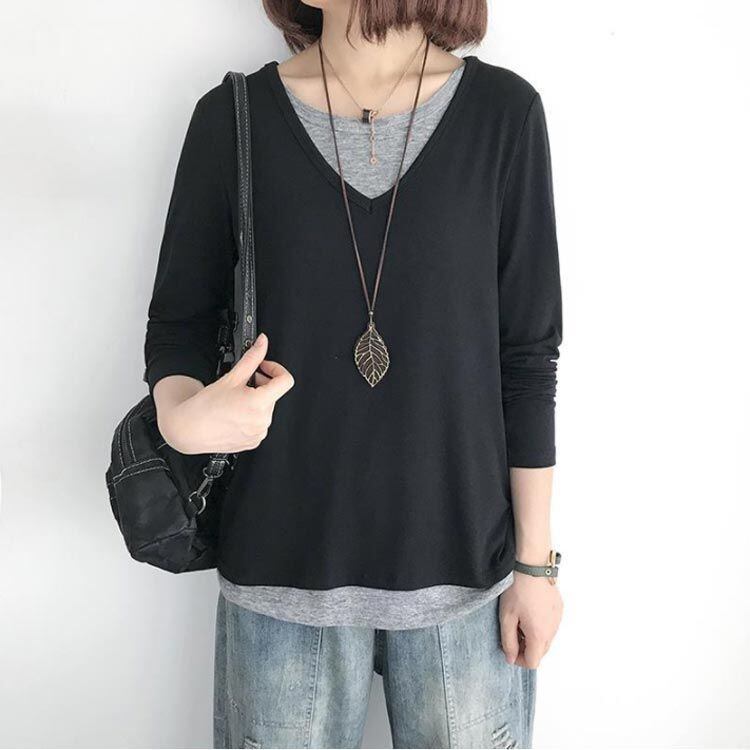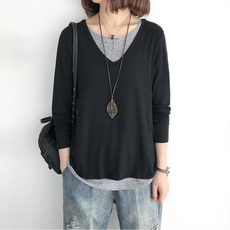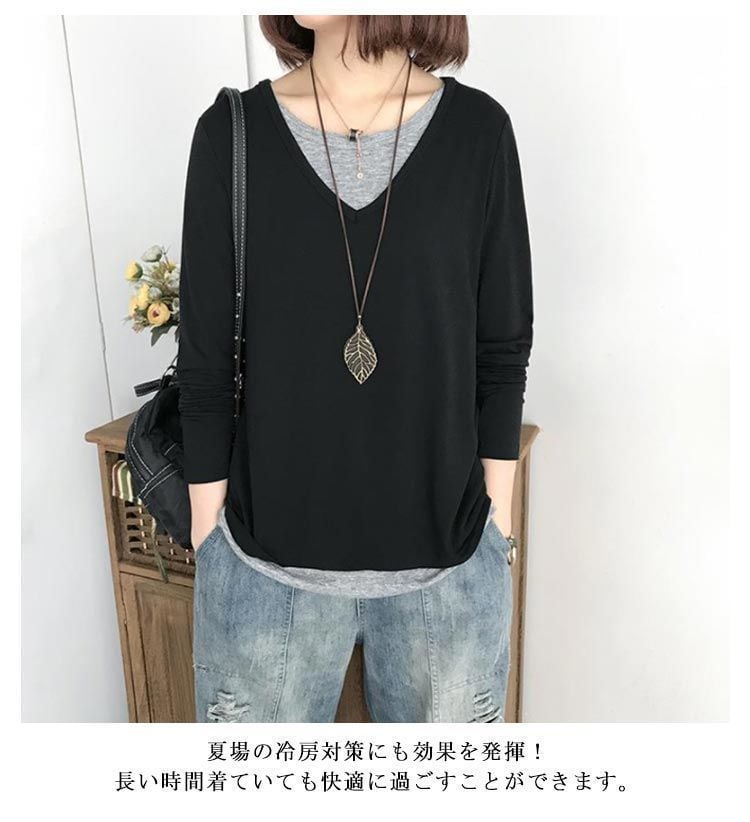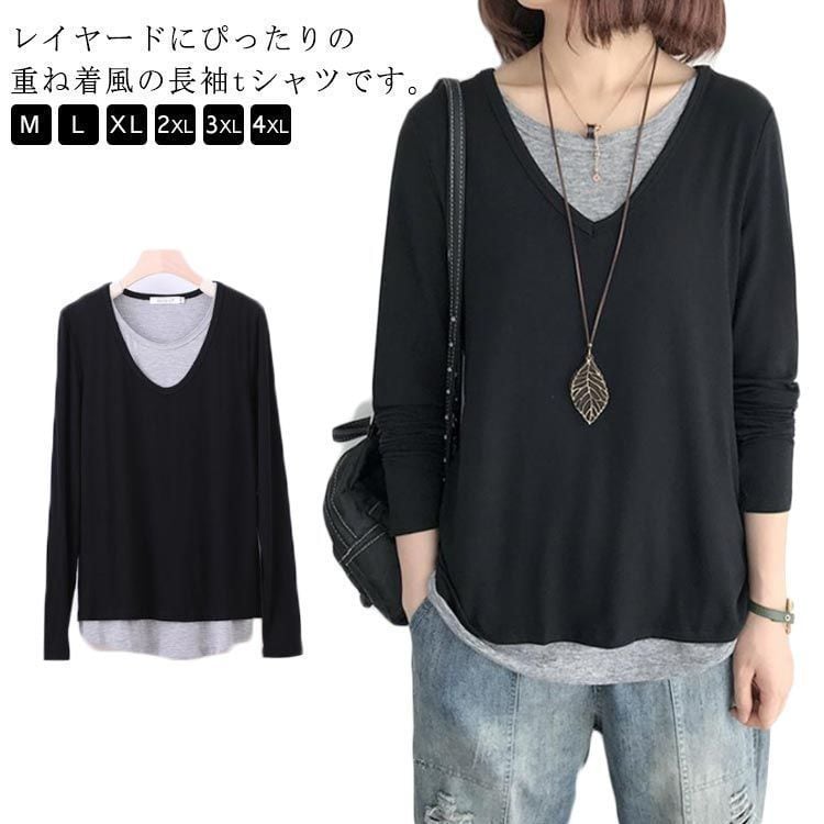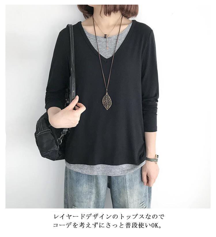 新品 春物 レイヤード tシャツ 重ね着風tシャツ レディース 長袖 春夏 トップス vネック チュニック 大きいサイズ ゆったり ロング丈 カジュアル おしゃれ 大人 切り替え 春 夏 秋 kkkonz
