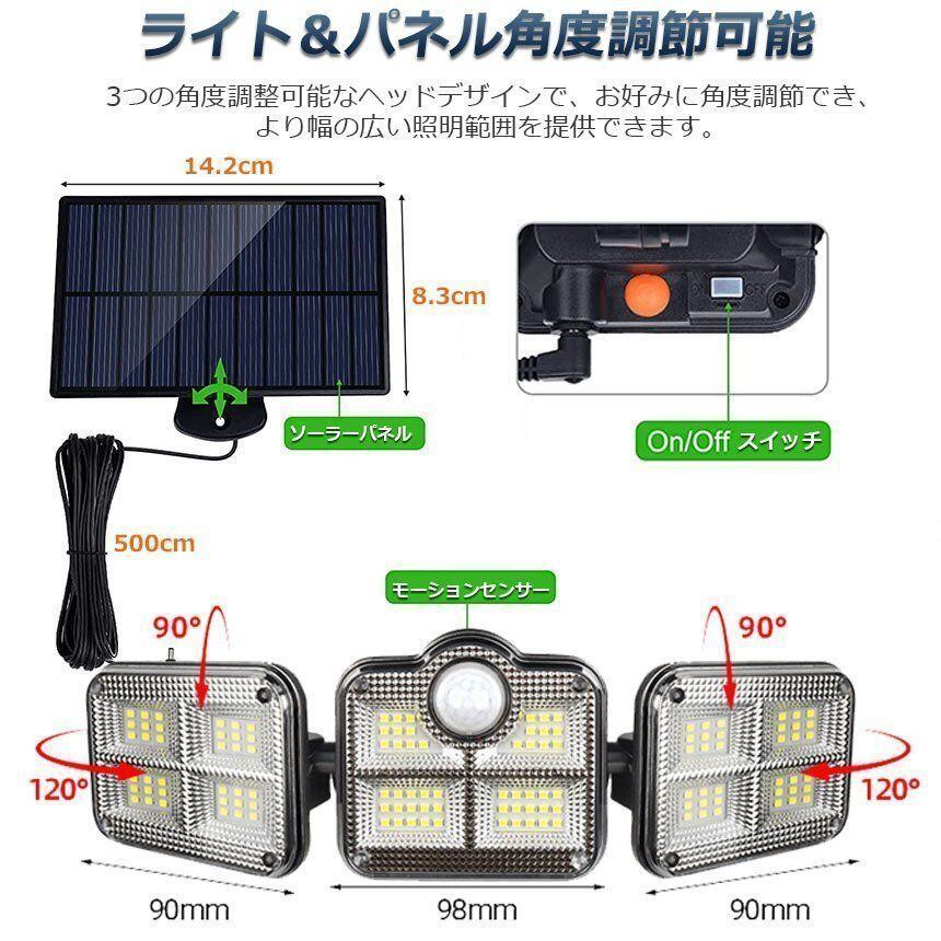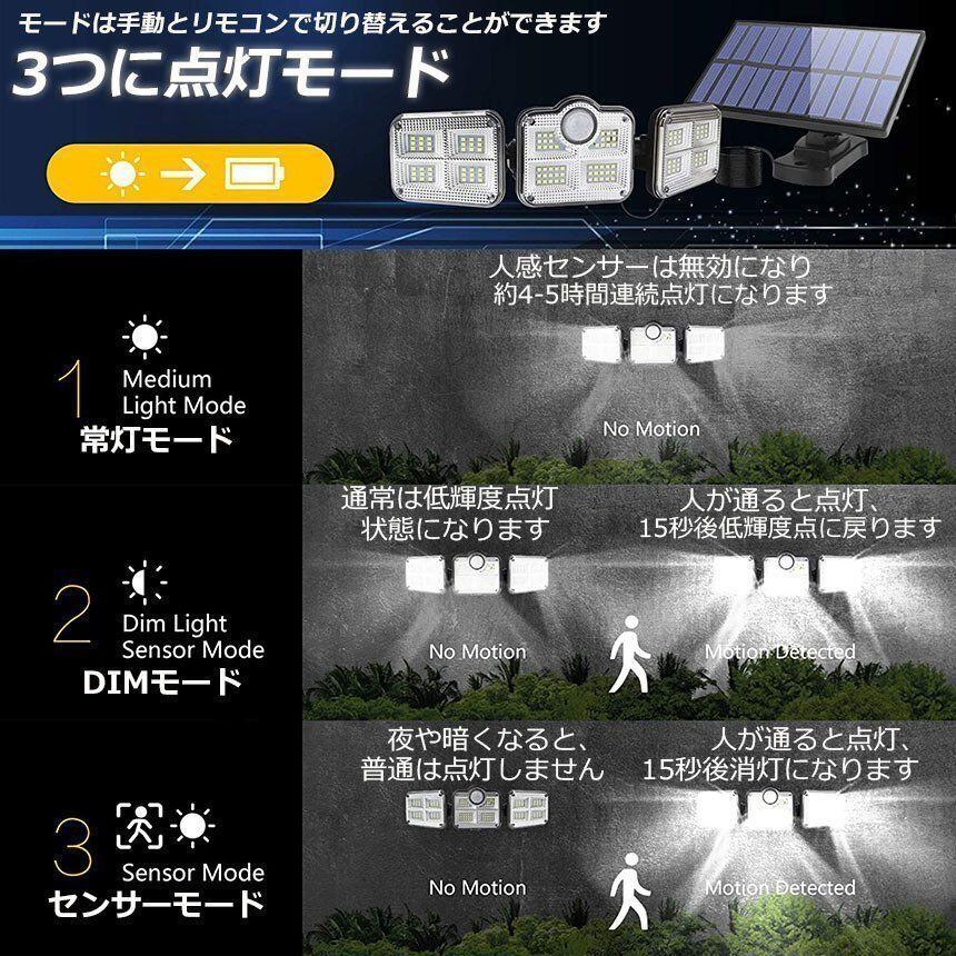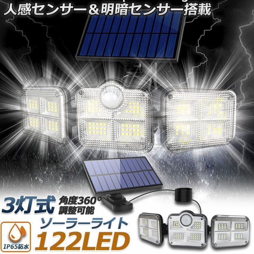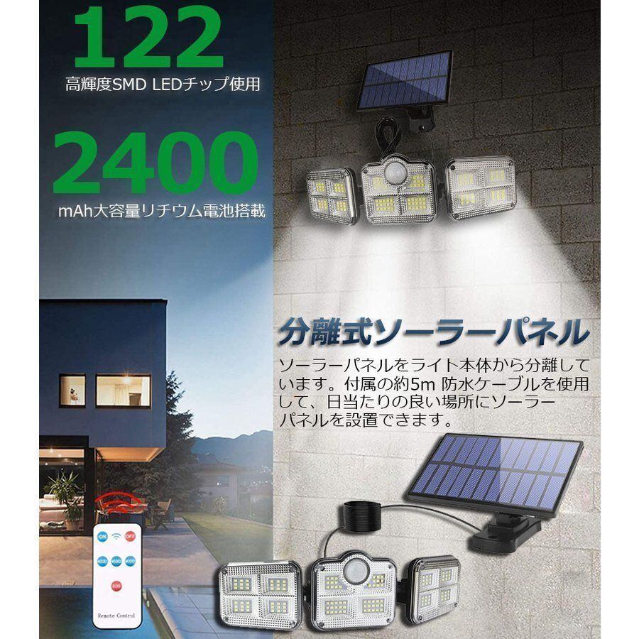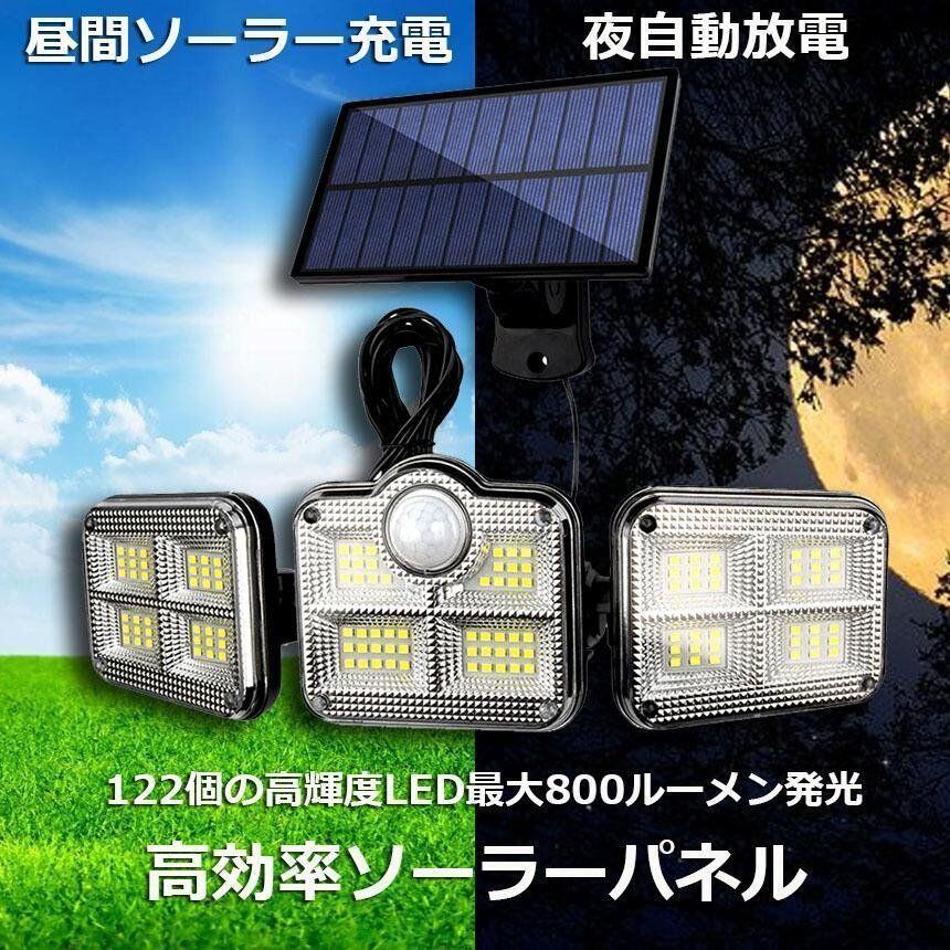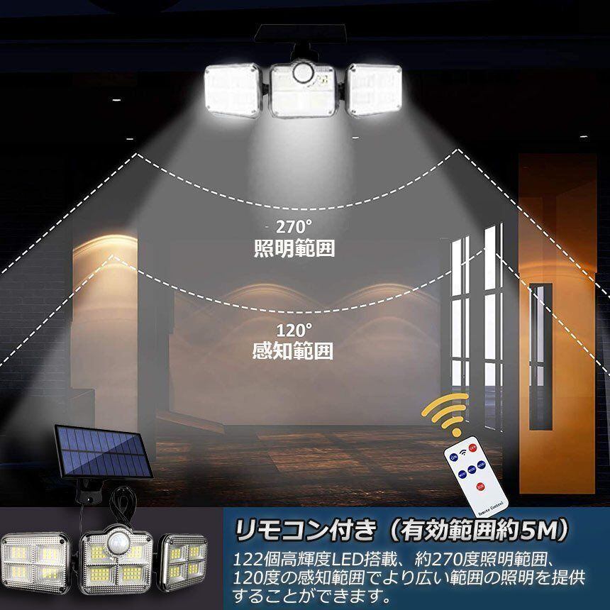 新品 ソーラーライト 122LED 3灯式 リモコン付き 5mコード付き センサーライト 防犯ライト ガーデンライト アウトドア ソーラーフラッドライト モーションセンサー付き キュリティライト 照明 IP65防水 防犯 人感 防水 屋外照明 kkkhsj