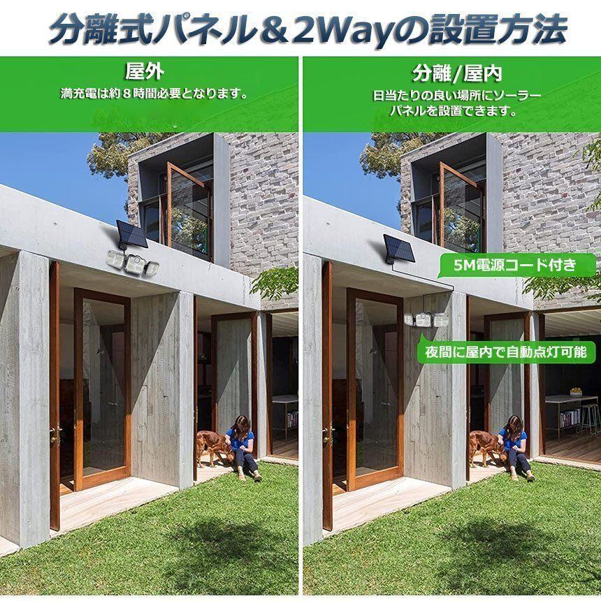 【202LEDソーラーライト】屋外ソーラーライトには202個のLEDチップが搭載しています。夜間の活動の安全性を確保するために、明るい光と、高感度センサー搭載。ソーラーパネルとライトを、5mのコードで別々に設置できます。ソーラーを太陽の良く当たる位置に設置、また方向へ向けられ、十分にソーラー充電できます。夜の防犯灯としてもすごく実 用的です。【ソーラーセンサーライト】動体センサーと明暗センサーがあり、昼間自動的に消灯して蓄電し、夜間に自動的に点灯します。