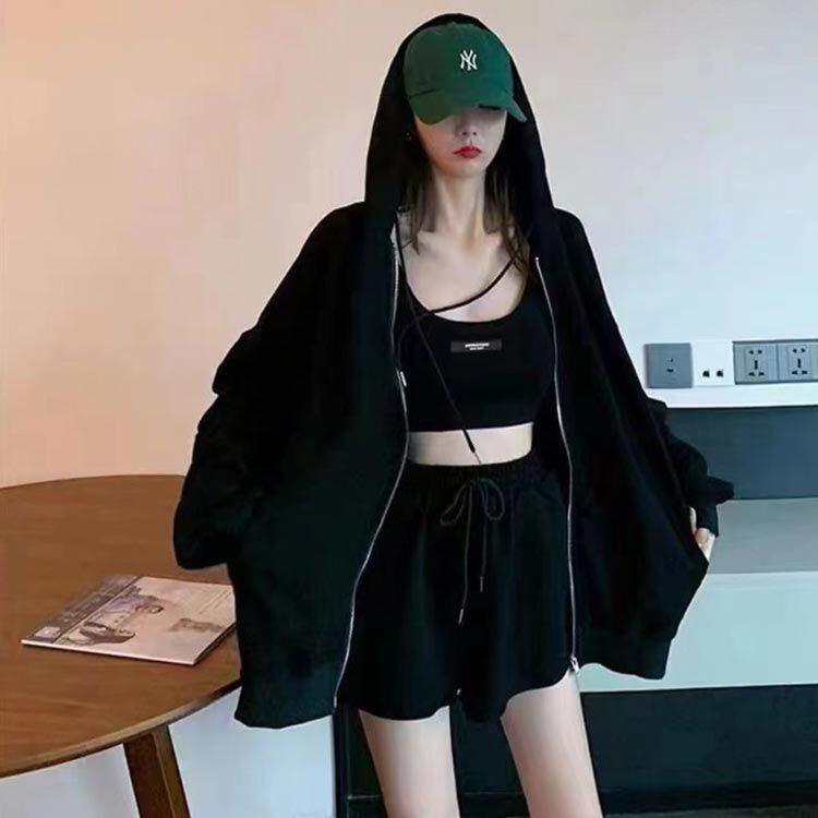 ゆるっとしたパーカーにクロップド丈のキャミとショーツのルームウェア3点セット。