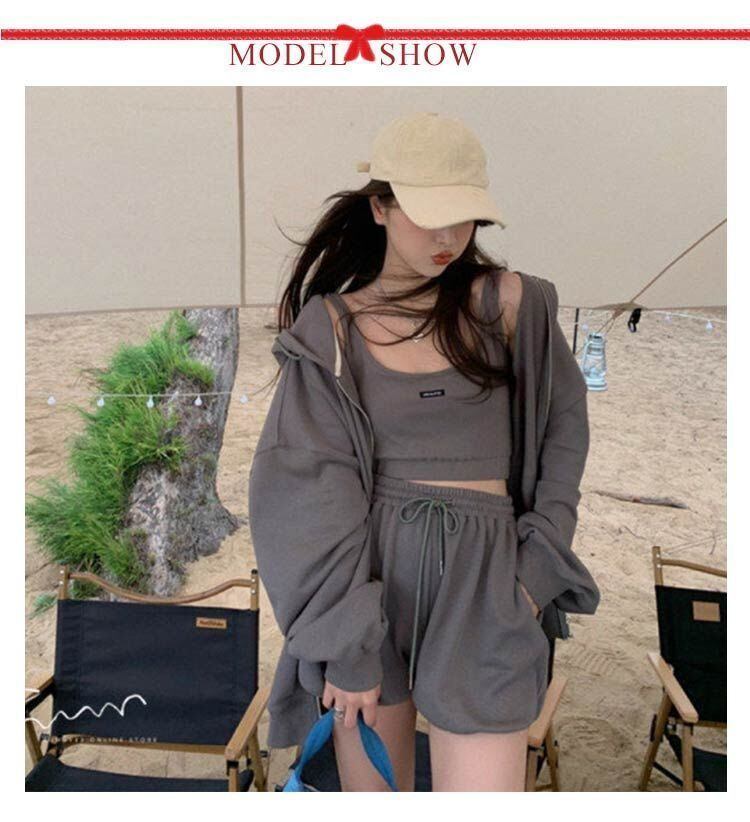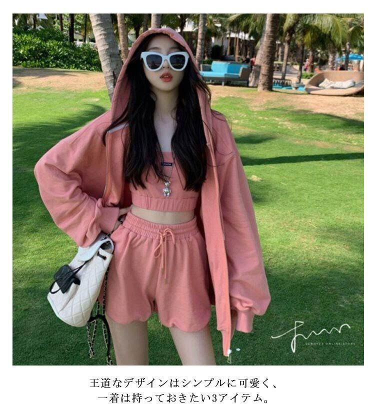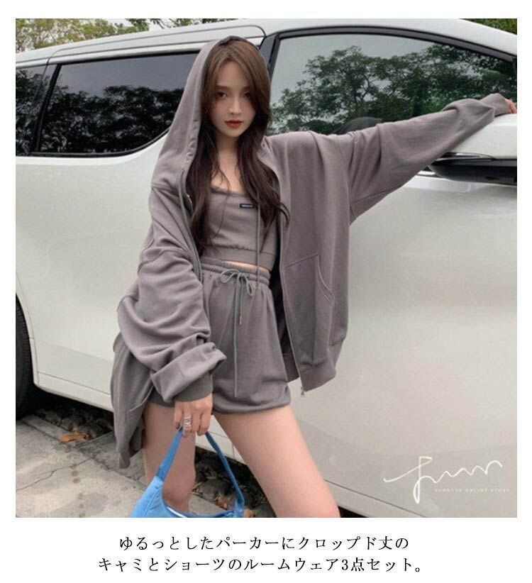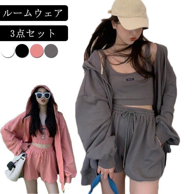 新品 ルームウェア レディース セットアップ 上下セット パーカー キャミ ショーツ 3点セット 春 部屋着 ワンマイルウェア 可愛い お洒落 シンプル 無地 クロップド丈 スウェット ポケット付き 韓国 kkkjpn