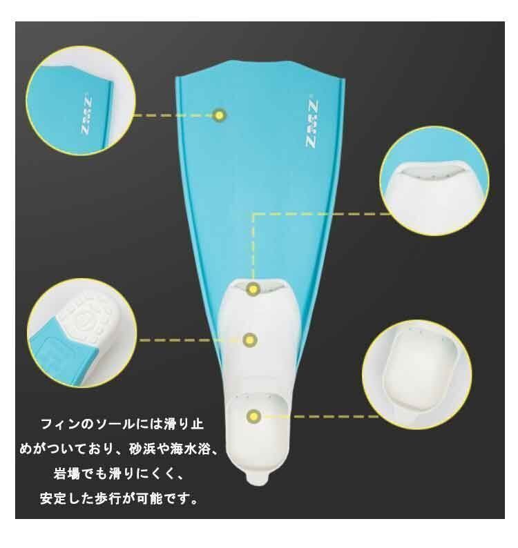フィンのソールには滑り止めがついており、砂浜や海水浴、岩場でも滑りにくく、安定した歩行が可能です。