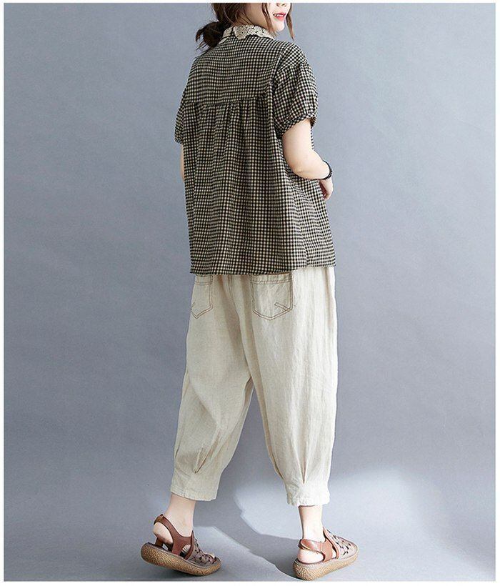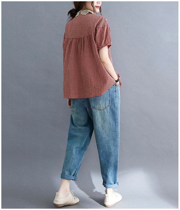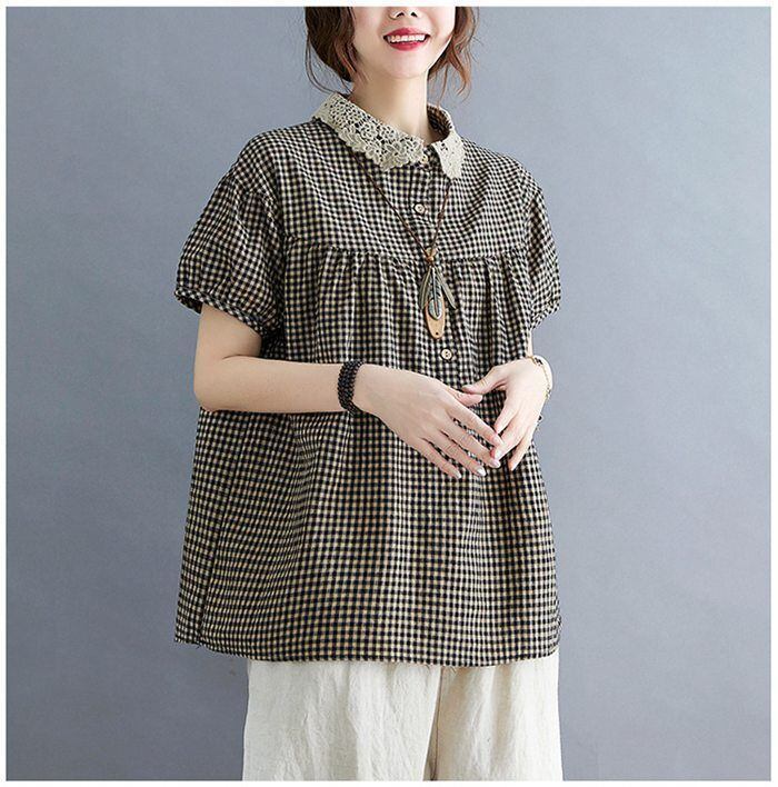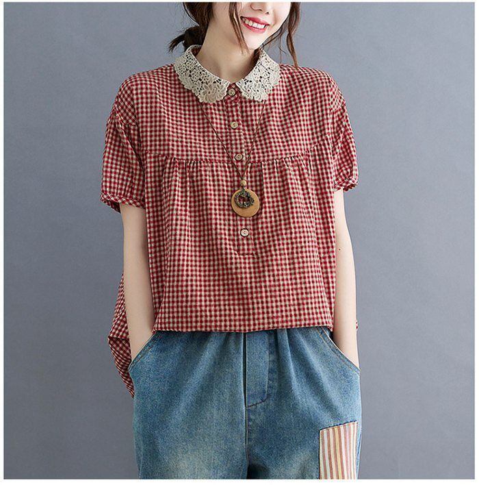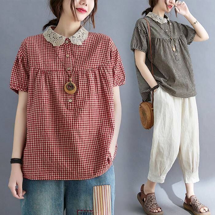 ブラウス 夏 レディース レース襟ブラウス ギンガムチェック 半袖 ブラウス コットン トップス プルオーバー 綿 チェック柄 ナチュラル 森ガール Tシャツ キレイめ 大きいサイズ ゆったり 体型カバー 夏 大人可愛い chaoliu395