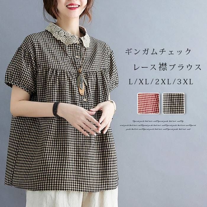 新品 ブラウス 夏 レディース レース襟ブラウス ギンガムチェック 半袖 ブラウス コットン トップス プルオーバー 綿 チェック柄 ナチュラル 森ガール Tシャツ キレイめ 大きいサイズ ゆったり 体型カバー 夏 大人可愛い kkkwra