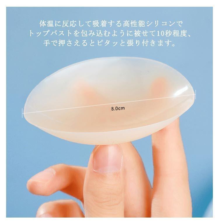 体温に反応して吸着する高性能シリコンでトップバストを包み込むように被せて10秒程度、手で押さえるとピタッと張り付きます。