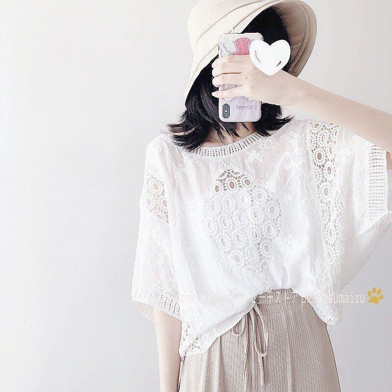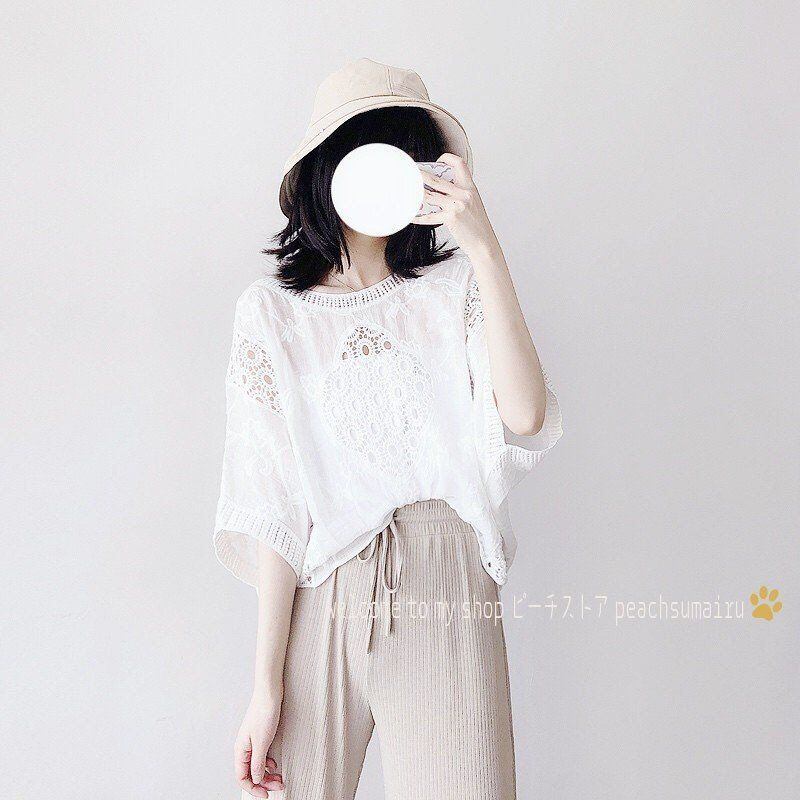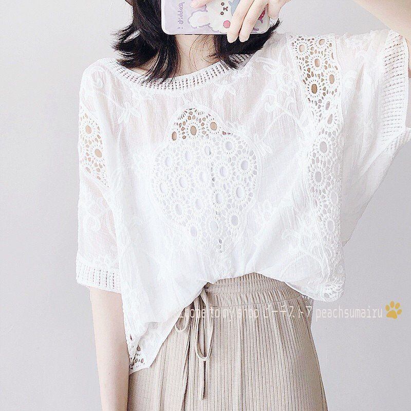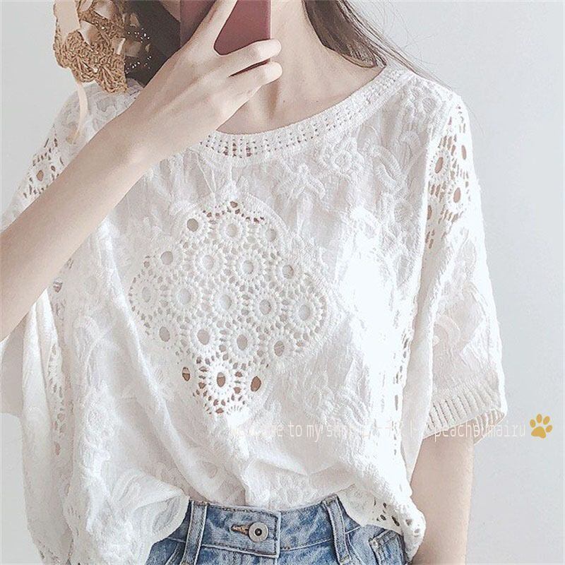 新品 ブラウス レディース きれいめ 40代 春夏 上品 レース花刺繍ブラウス 白シャツ vネックトップス 五分袖 ゆったり オシャレ 韓国風 大人 Tシャツ30代 50代 kkkqao