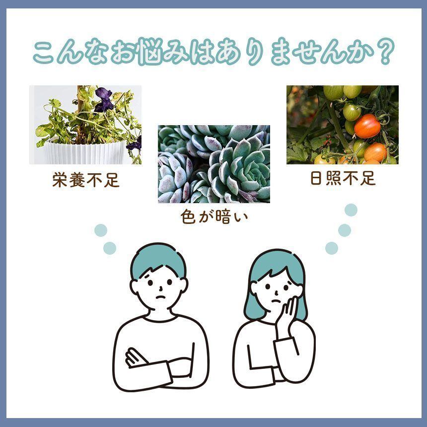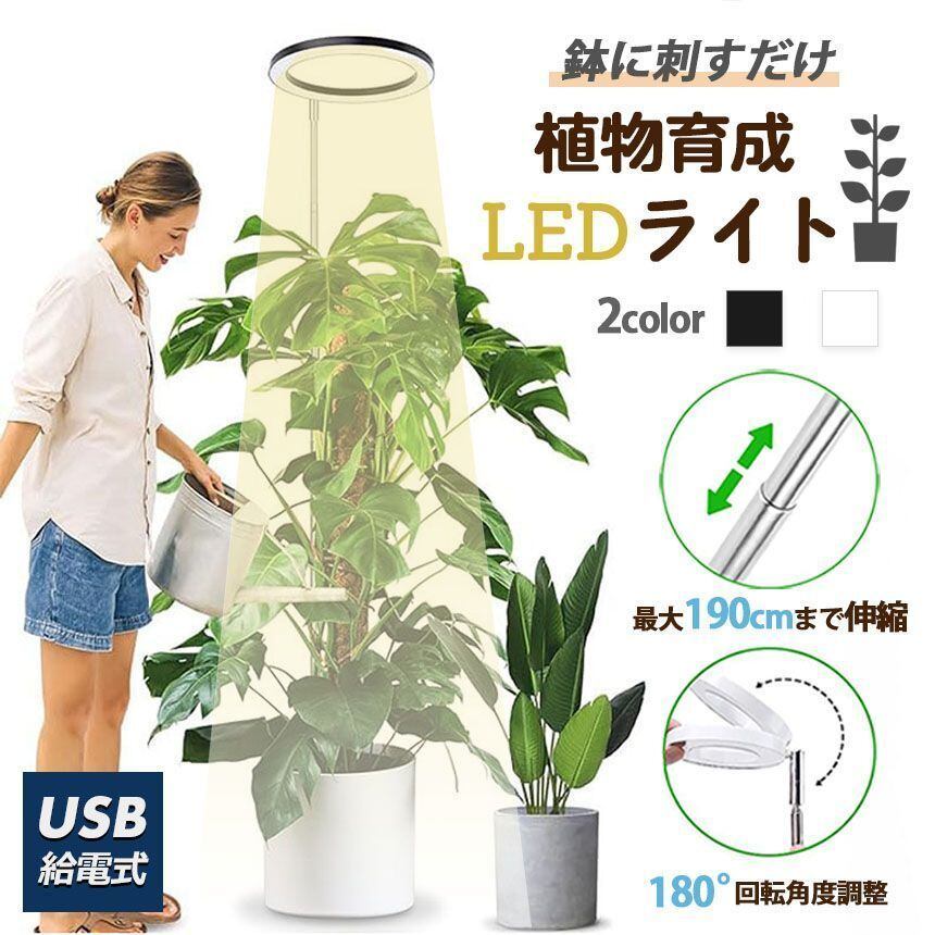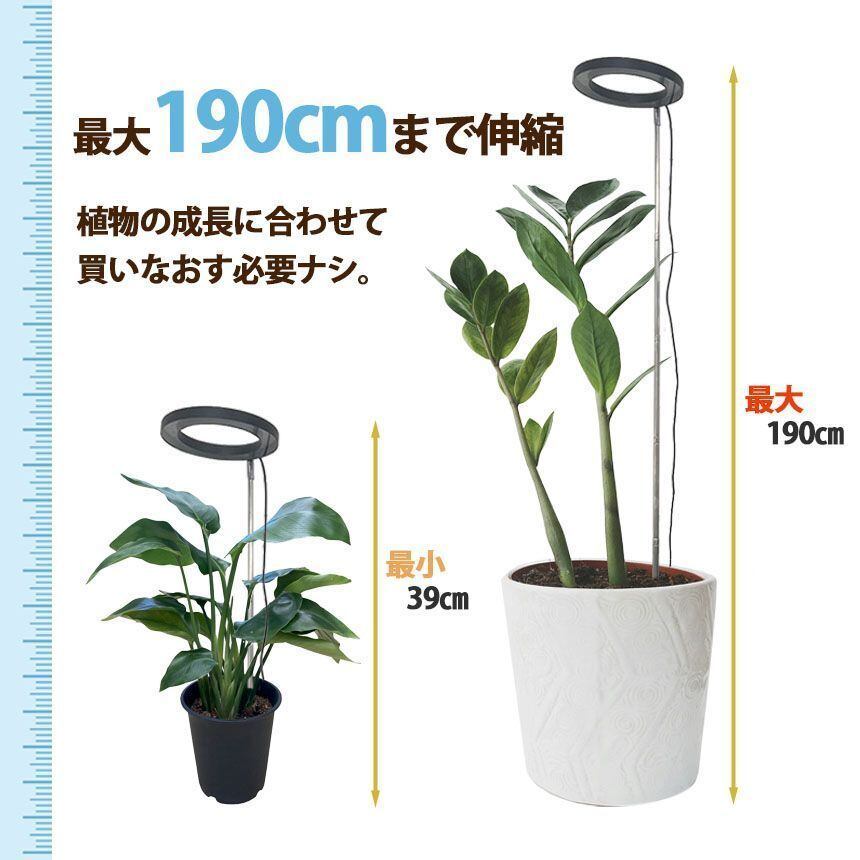 広い照射範囲 / 180度回転角度調整 / 様々な機能付き / 190cmまで伸縮可能 / 鉢に刺すだけ簡単設置