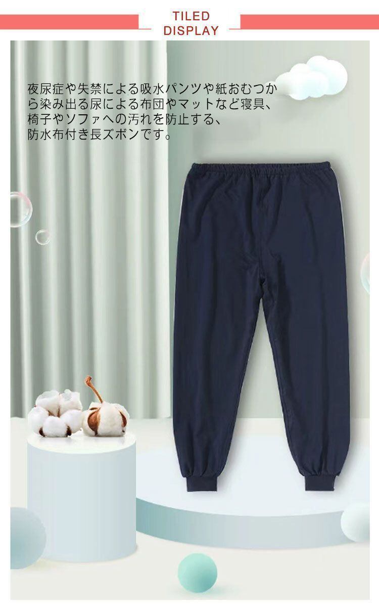 夜尿症や失禁による吸水パンツや紙おむつから染み出る尿による布団やマットなど寝具、椅子やソファへの汚れを防止する、防水布付き長ズボンです。