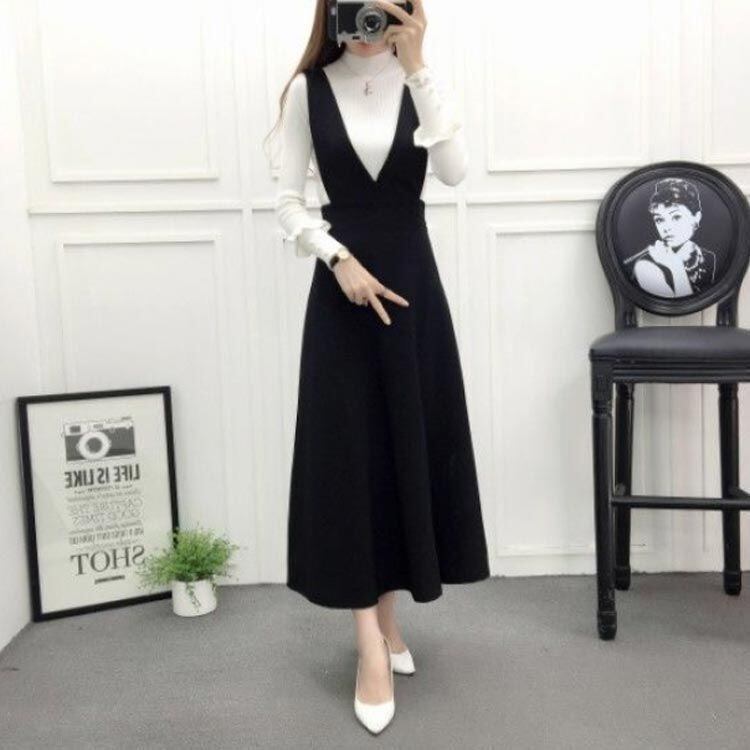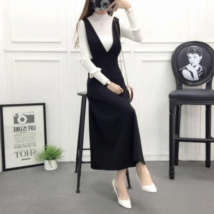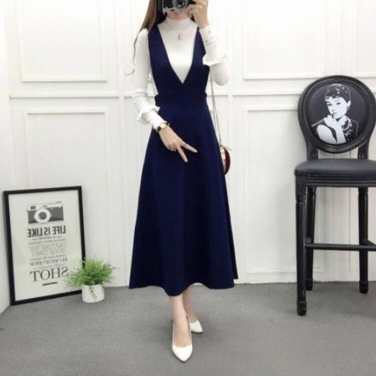 深めのVネックでレイヤードスタイルを楽しめるジャンパースカート