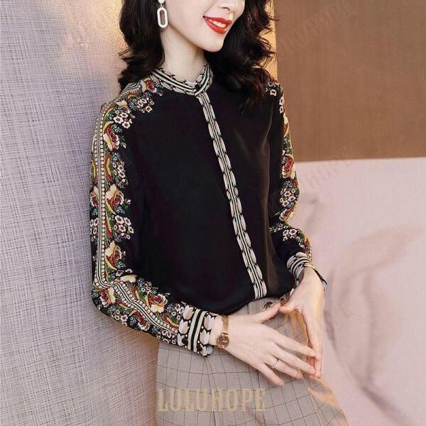 新品 ブラウス シャツ 大人 花柄 長袖 シック サテンブラウス きれいめ 個性的 ブラック母親 お出かけファッション エレガント イベント 清楚 お呼ばれ オシャレ ラフ kkkkpg