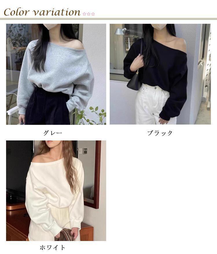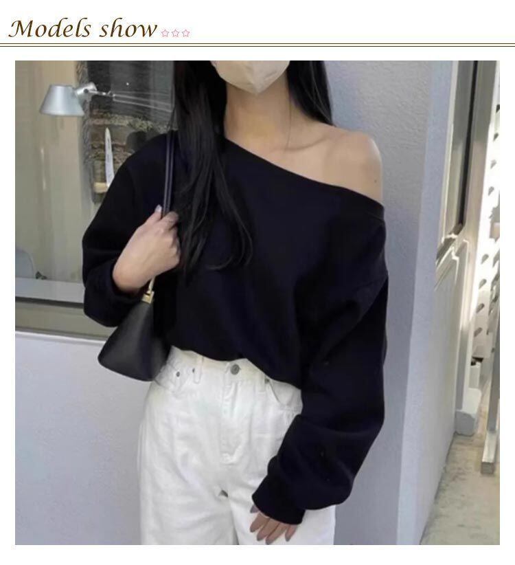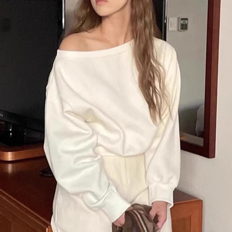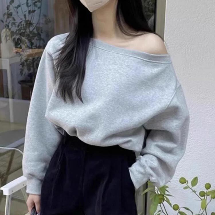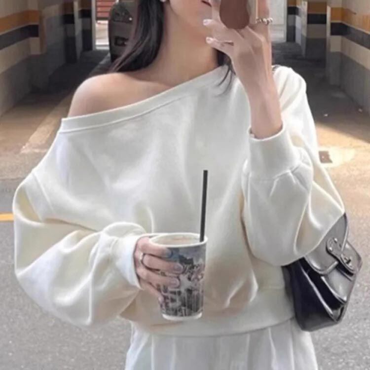 新品 オフショルダー スウェット レディース 春 トレーナ トップス 長袖 ゆったり カジュアル 無地 オーバーサイズ 韓国ファッション カットソー ボリューム袖 オフショルダートップス 可愛い ホワイト kkkmgy