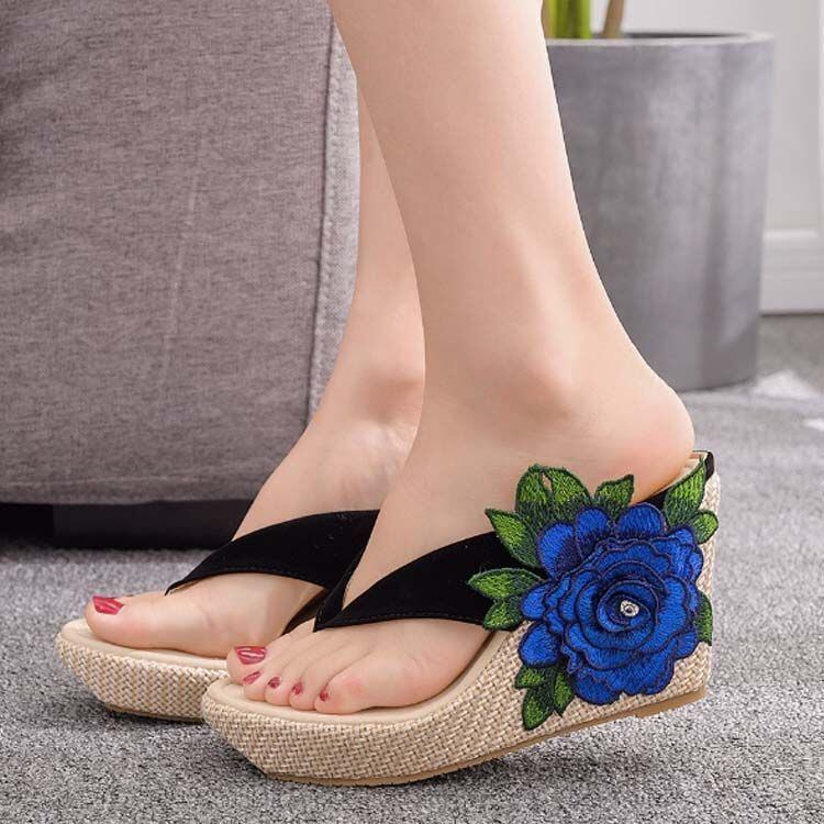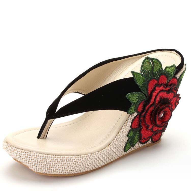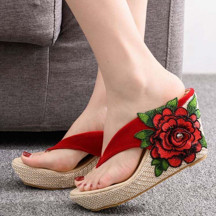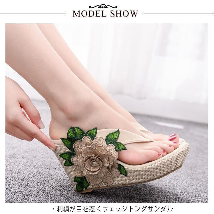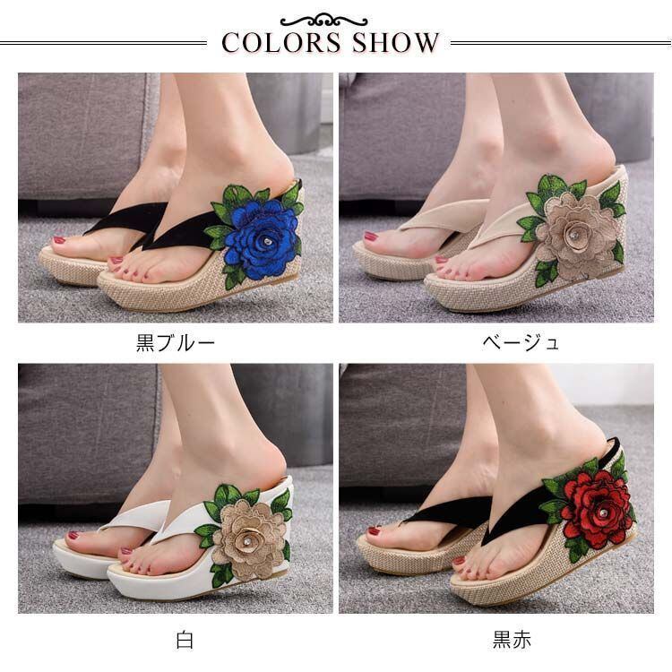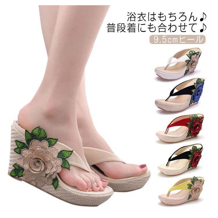 新品 ウェッジトングサンダル ヒール ウェッジソール 9.5cmヒール 浴衣 刺繍 刺しゅう ローズ 花柄 クロス 婦人靴 靴 歩きやすい 痛くない 軽い 鼻緒 着物 甚平 袴 夏祭り 旅館 温泉 旅行 夏 kkkzjx