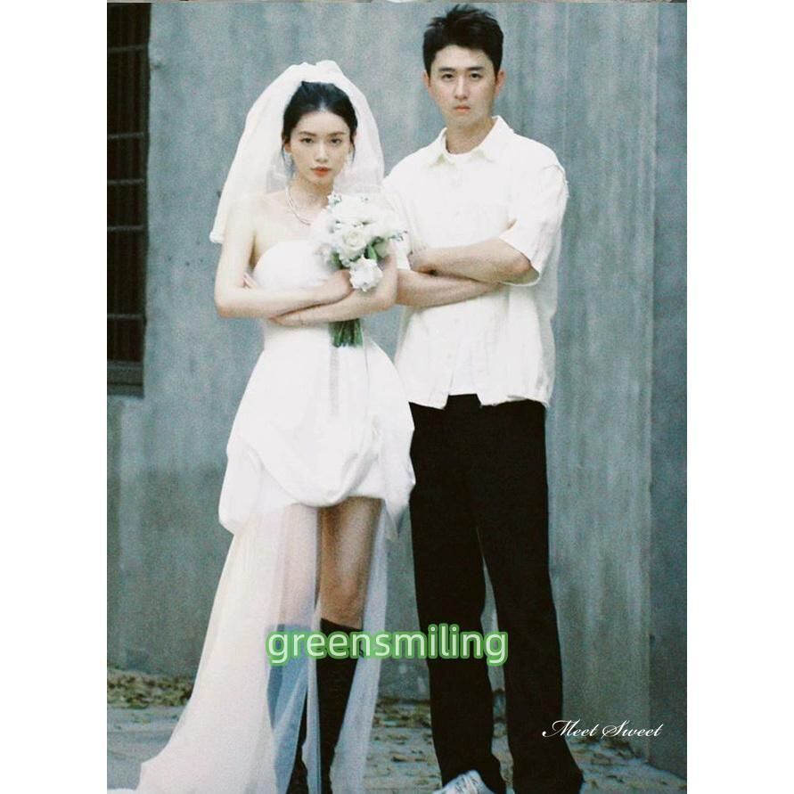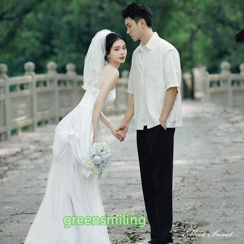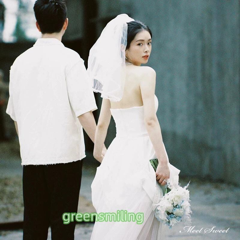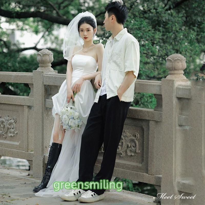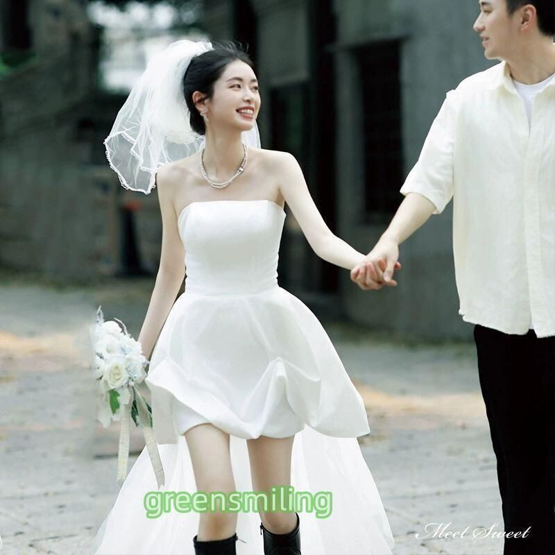 新品 ウェディングドレス ミニドレス 前短後長ドレス ビスチェ ベアトップ サテン ワンピース 二次会 結婚式 前撮り ブライダル 花嫁 ウエディングドレス kkkspw