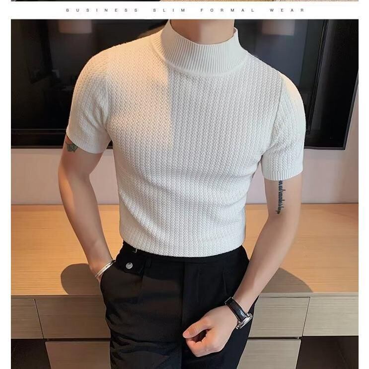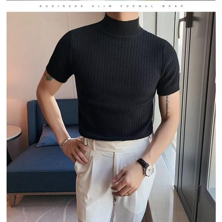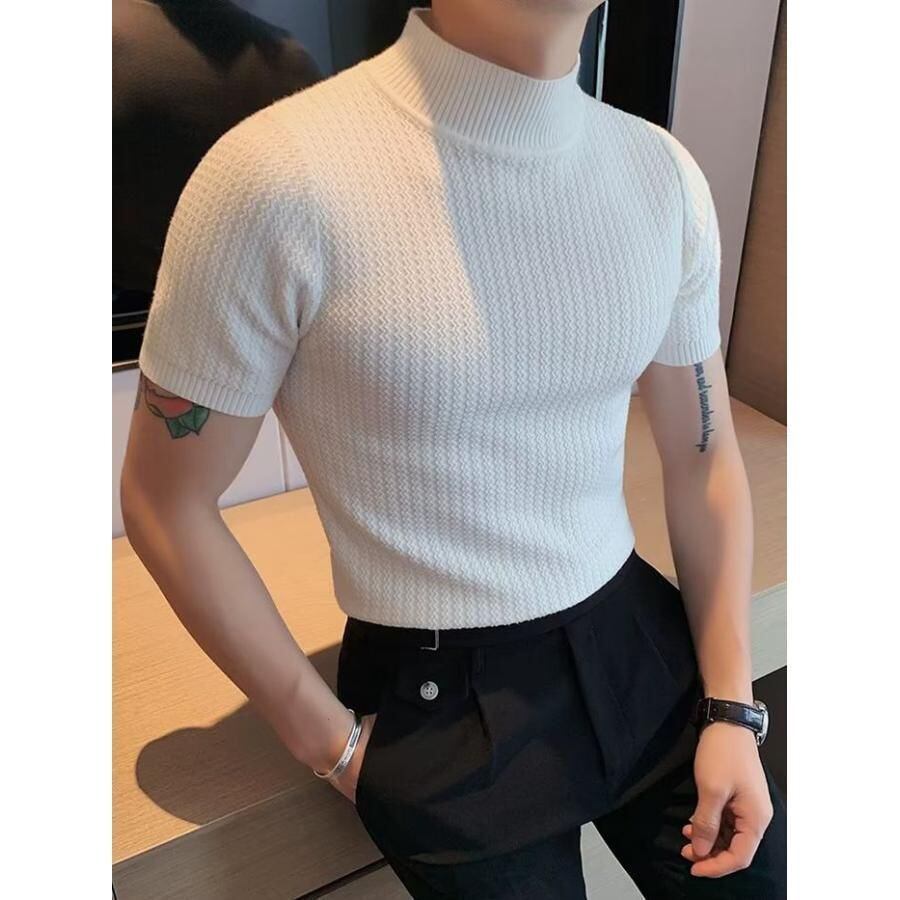新品 サマーニット メンズ Tシャツ 半袖 トップス ニット 春 ハイネック カットソー 夏服 吸汗 通気性 インナー 無地 涼しい 軽量 快適 kkklty
