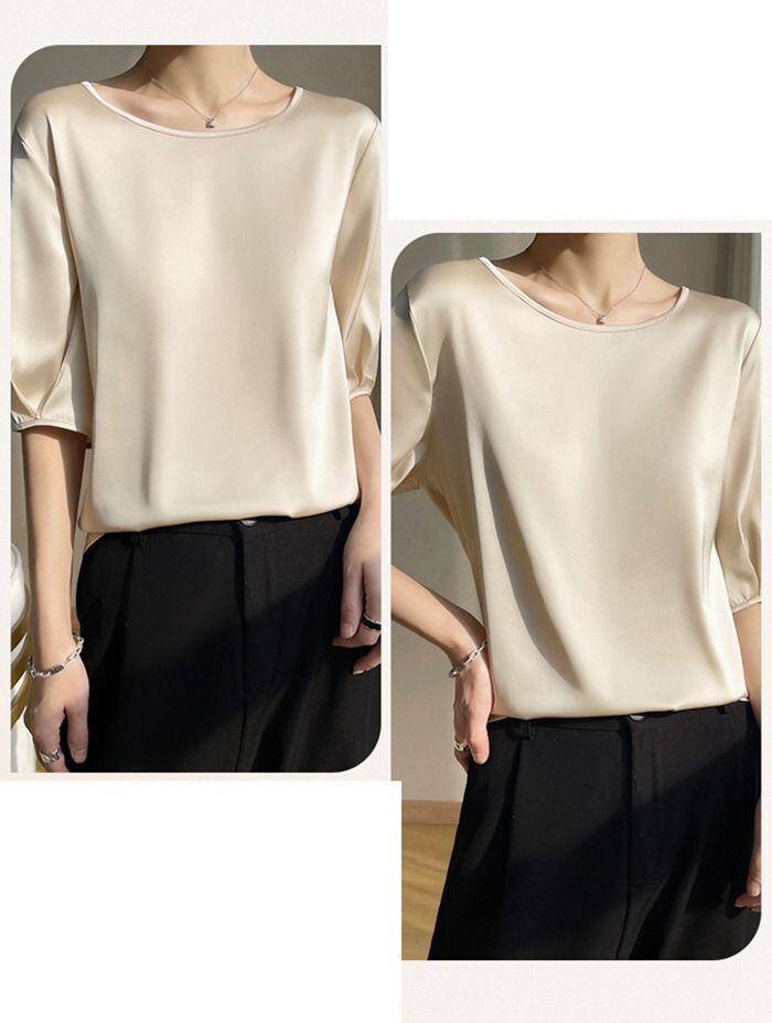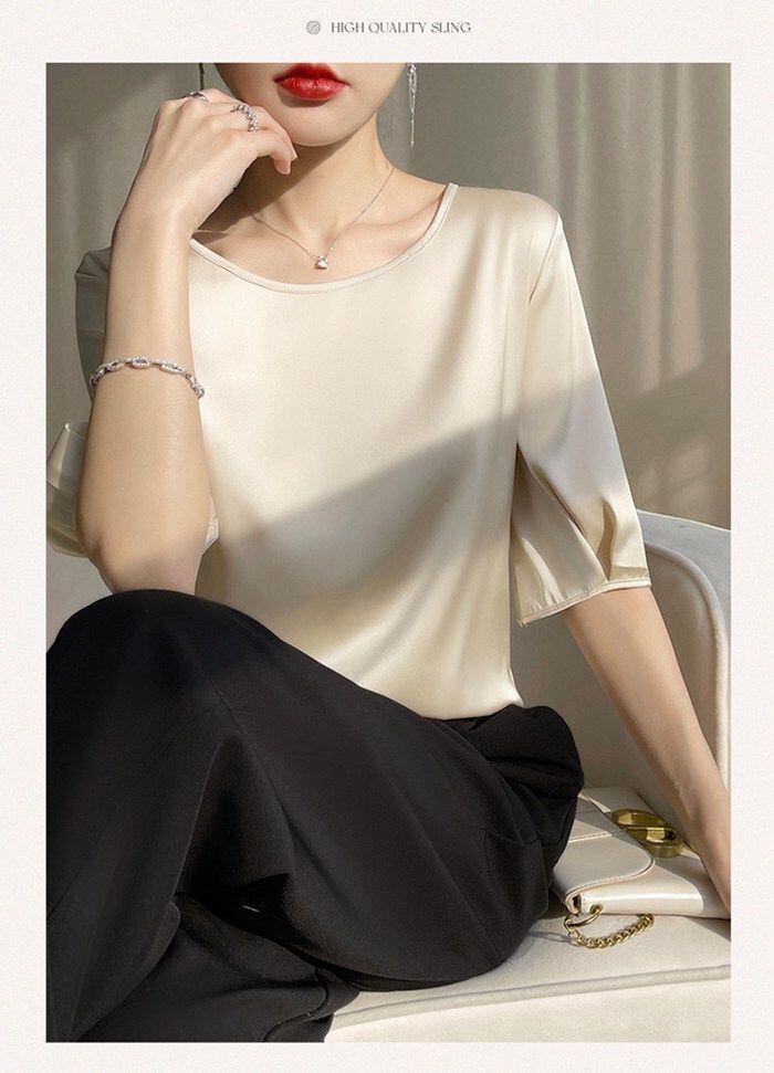新品 サテンブラウス 華奢見え 半袖 レディース おしゃれ トップス サテンブラウス シルクような触り tシャツ 柔らか 光沢感 上品 オフィス 通勤 ゆったり 体型カバー 夏 kkkugp