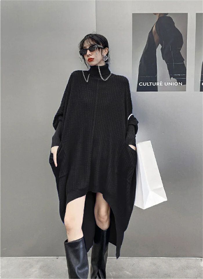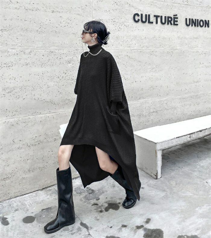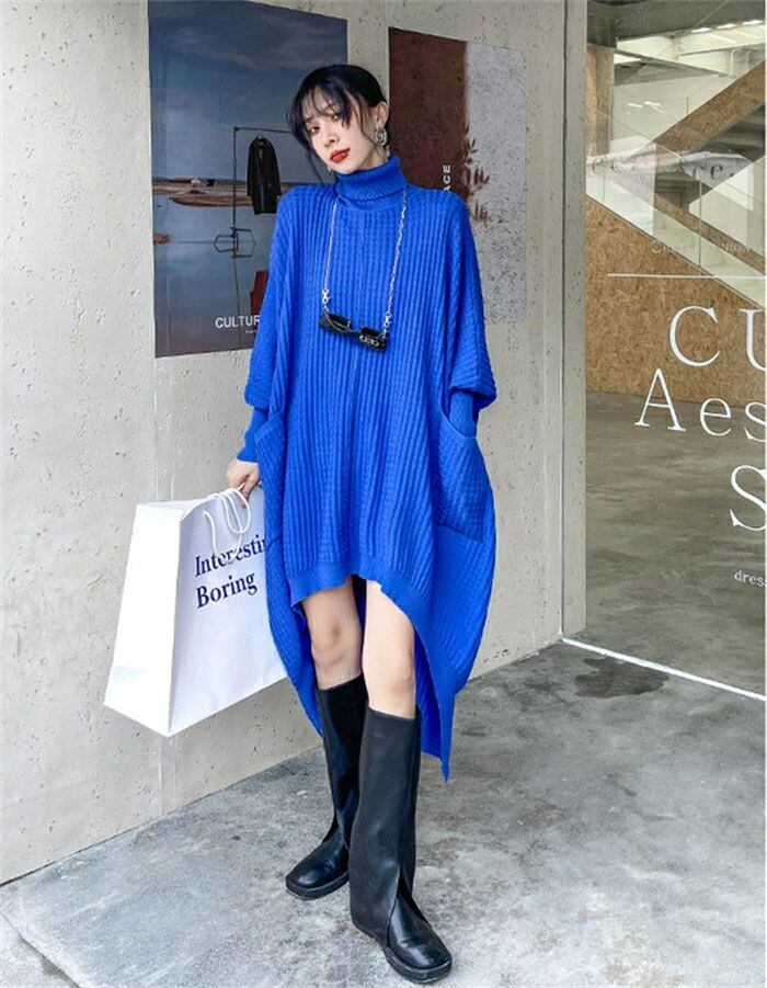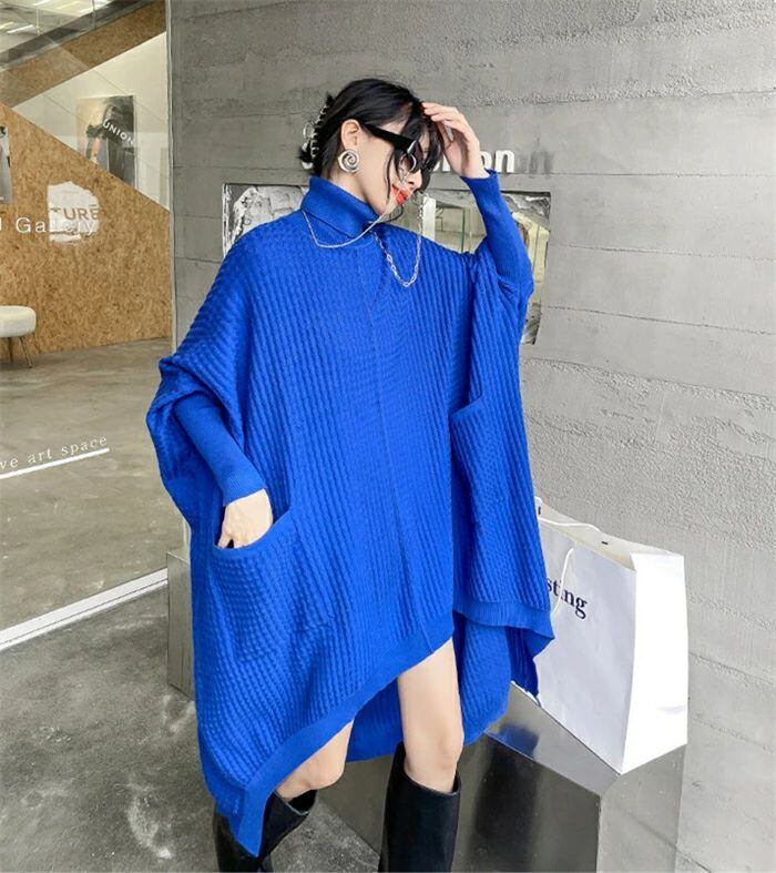 ニットワンピース ロング ワンピース レディース 秋冬 長袖 デザインドルマン前後差 タートルネック ニットワンピース ロングワンピ 個性的