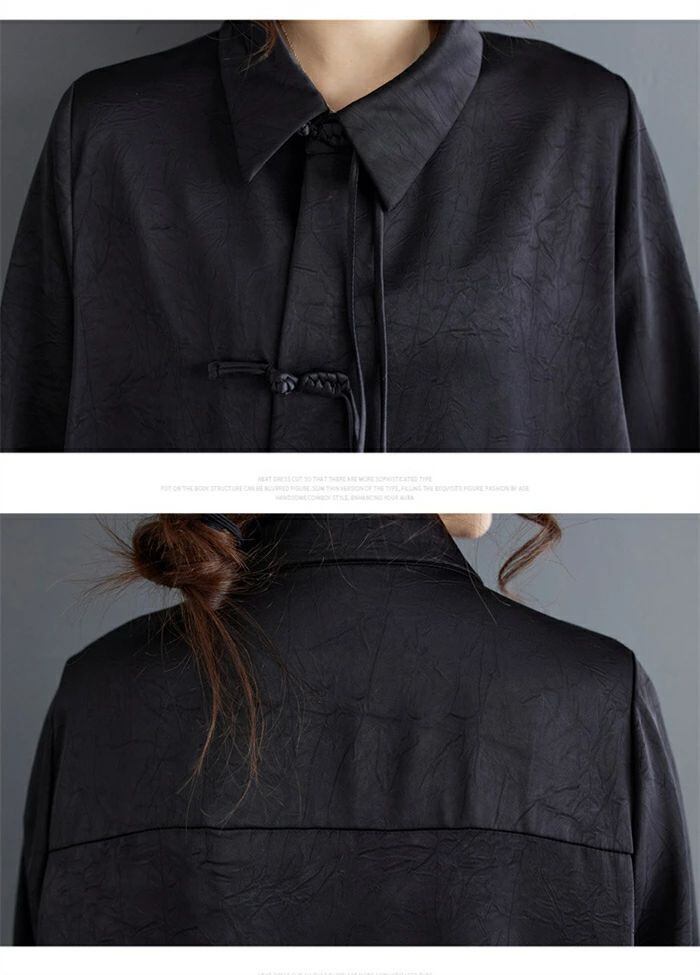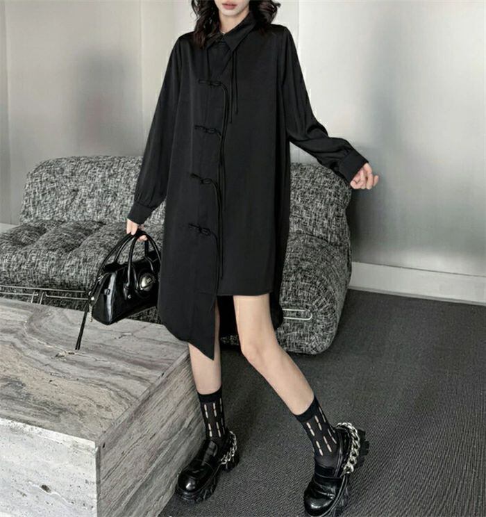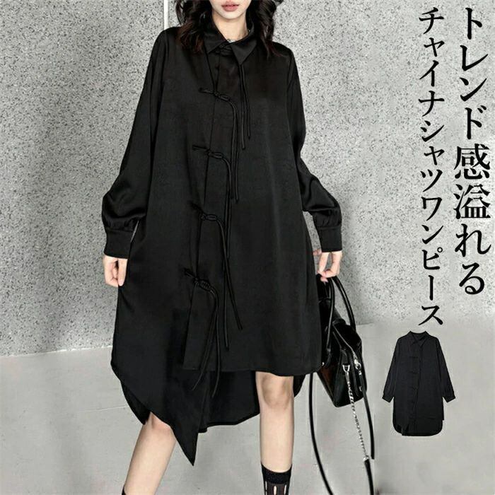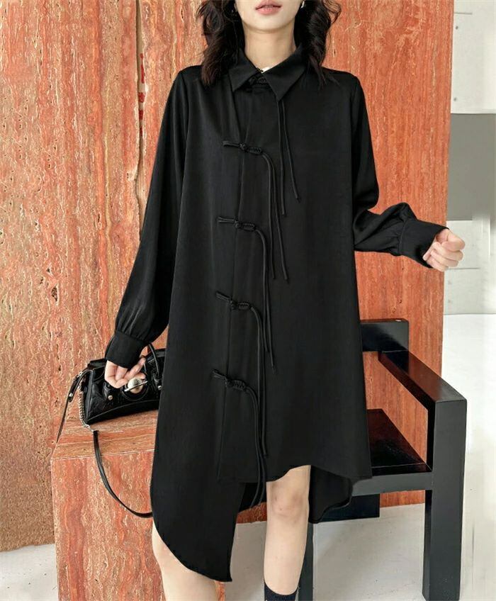 シャツワンピース レディース 長袖 襟付き チャイナワンピース シャツワンピース 中華風 アシンメトリーヘムデザイン ヘム 斜めドレープ 大