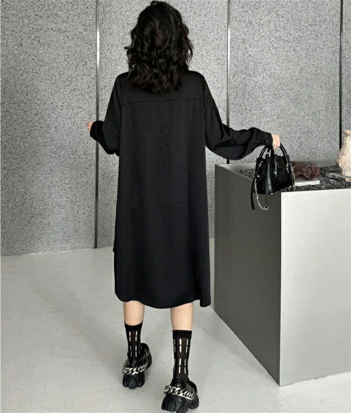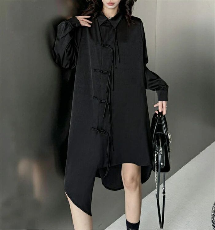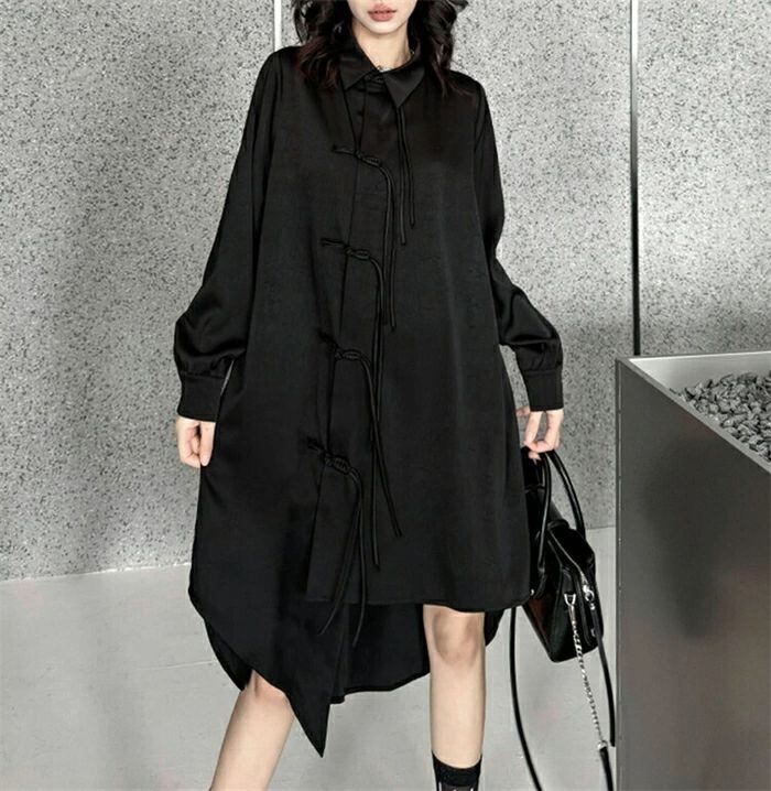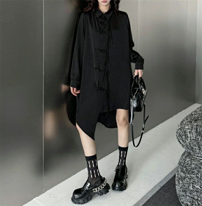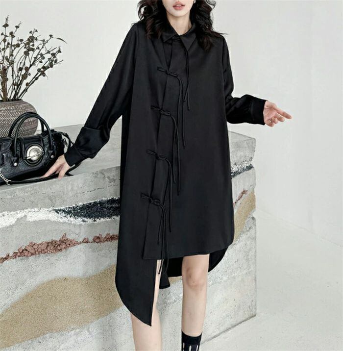 シャツワンピース レディース 長袖 襟付き チャイナワンピース シャツワンピース 中華風 アシンメトリーヘムデザイン ヘム 斜めドレープ 大きいサイズ 前開き 羽織り 変形デザイン 個性的 モード系 メンズ ユニセックス かっこいい 着痩せ 20代 30代 40代 送料無料 ビッグシルエット オーバーサイズ 着痩せ 無地 長袖 楽チン シンプル 通勤 通学 お出掛け お食事会 パーティ フォーマル カジュアル 女子会 発表会 演奏会 同窓会 卒業式 入学式 卒園式 成人式 就活 オフィス ビジネス 20代 30代 40代 50代
