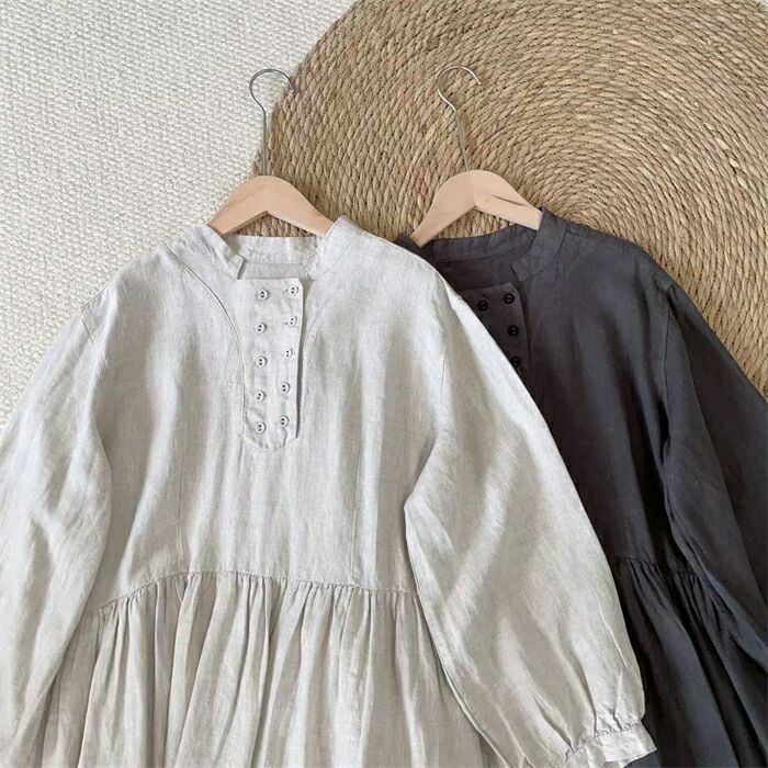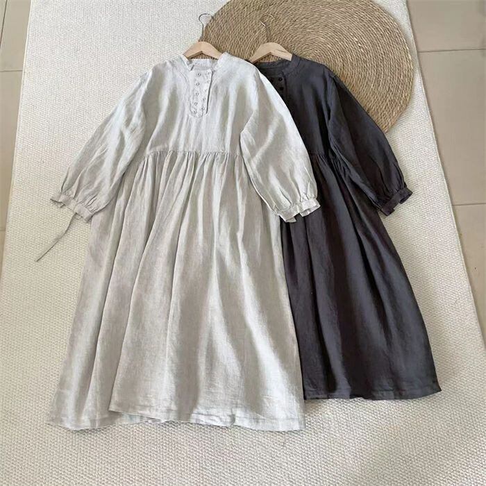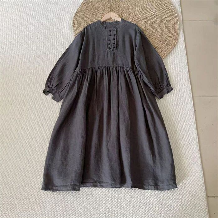 リネンワンピース レディース バンドカラー 長袖ワンピース 秋新作 麻100% きれいめ ロングワンピース カジュアル Aライン ギャザーワンピ