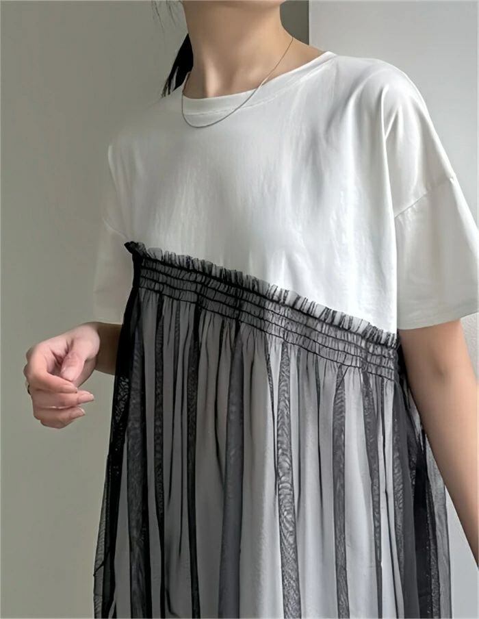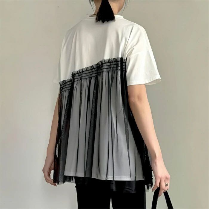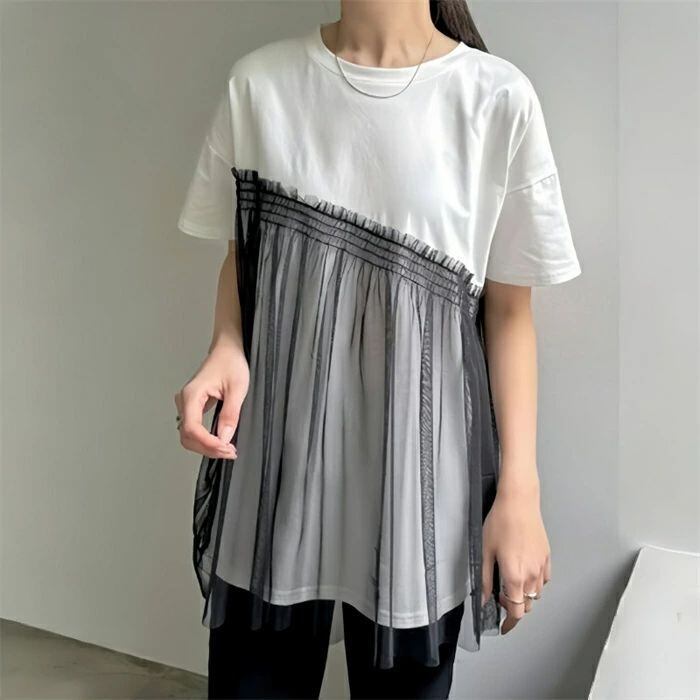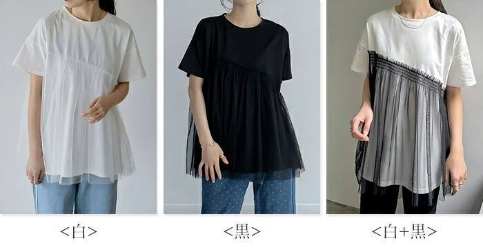 チュール ドッキングトップス Tシャツ トップス 半袖 カジュアル 個性的 大人 可愛い 主婦 春 夏 切り替え 透け シースルー お腹周り 体型カバー ゆったり 白 ホワイト 普段着 レディース アシンメトリーTシャツ 異素材切り替え 個性派 通勤 妊婦 ママ 母 ナチュラル 大人可愛い カジュアル ゆったり きれいめ おしゃれ オフィス 楽ちん サマー 20代 30代 40代 送料無料