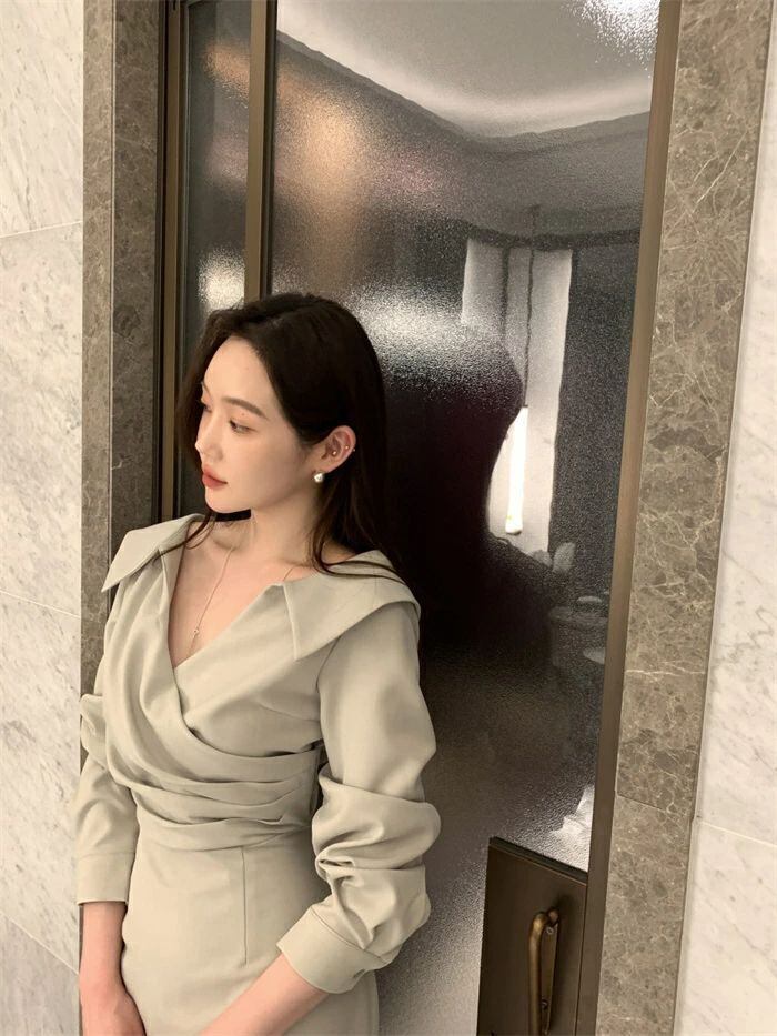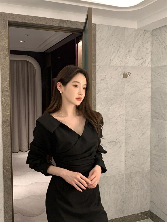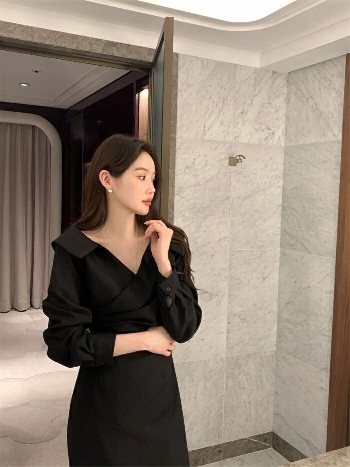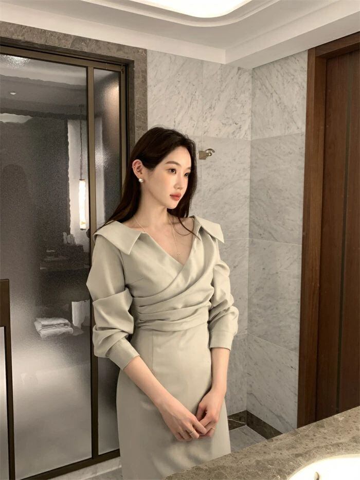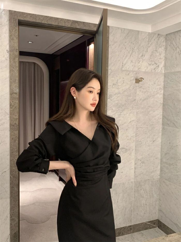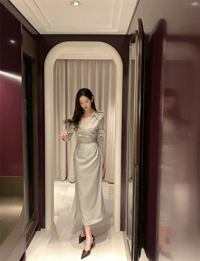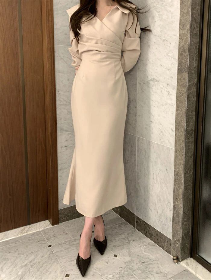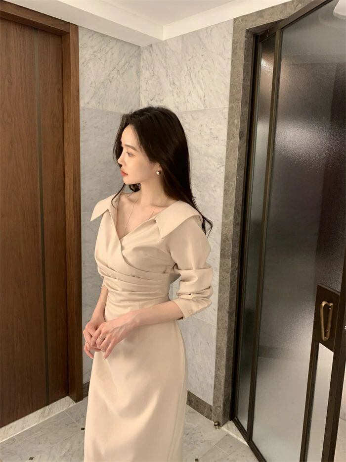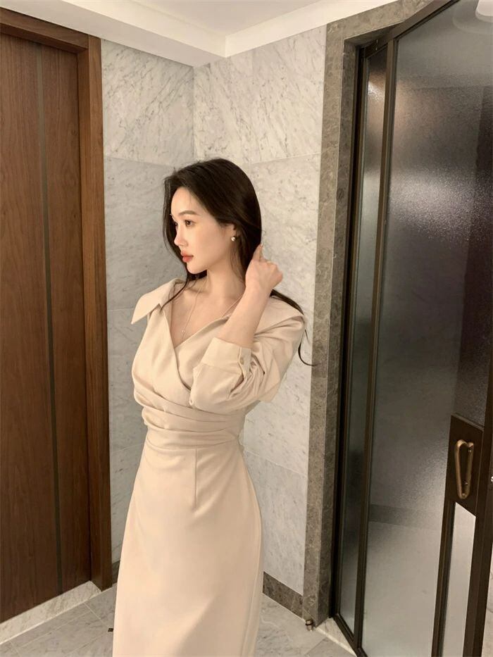ワンピース レディース 春秋 ロングワンピース ロング丈 長袖 ワンピ 襟付き Vネック ウエストデザイン エレガント 無地 ゆったり 着?せ フェミニン 謝恩会 パーティードレス 女性 カジュアル おしゃれ 20代 30代 40代 50代 送料無料