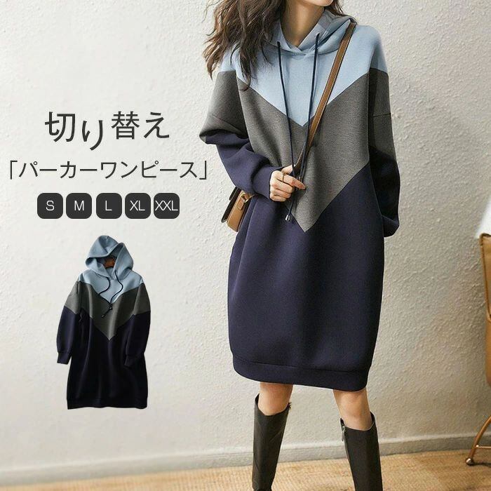 ワンピース ワンピ レディース 春秋 パーカーワンピース ロングパーカー 切り替え ワンピ 長袖 フード付き 大きいサイズ 切り替えワンピー