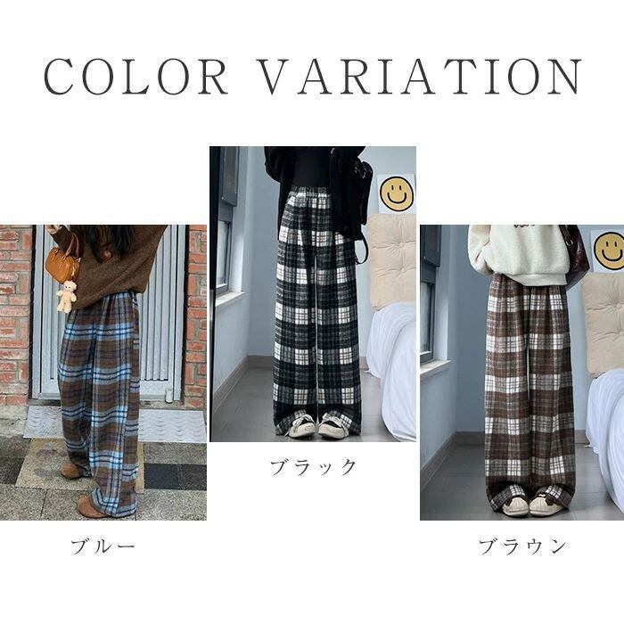 パンツ ワイドパンツ レディース チェックパンツ チェック柄 裏起毛 秋 冬 ボトムス ロングパンツ ウエストゴム ハイウエスト イージーパン