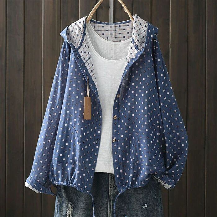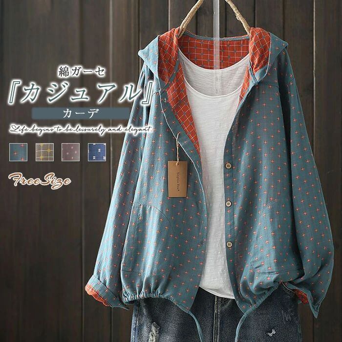 カーディガン レディース 綿ガーゼ シャツ カーデ アウター 総柄 長袖 フード付き 薄手 ライトアウター 羽織 ポケット 柔らかい 上品 トップス フォーマル オフィス シンプル カジュアル 前開き 散歩 キャンプ 30代 40代 50代 送料無料