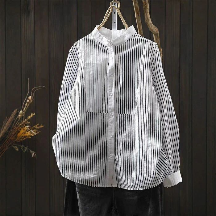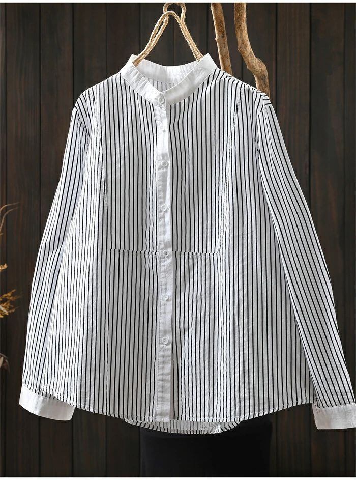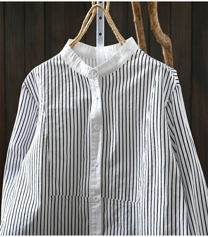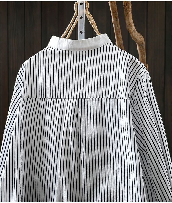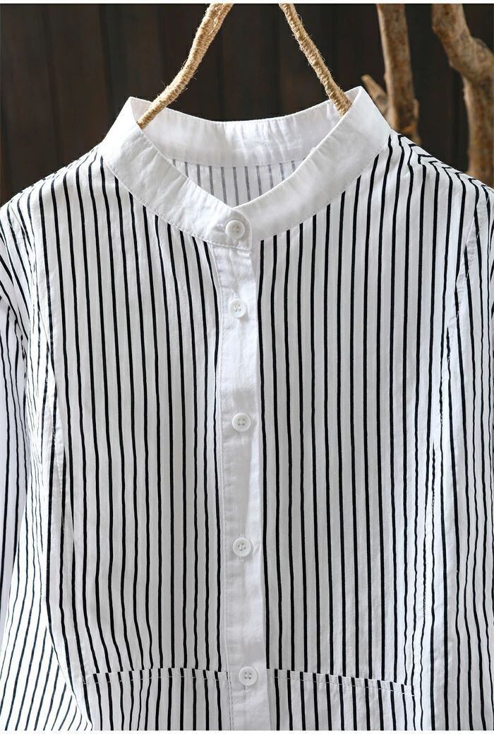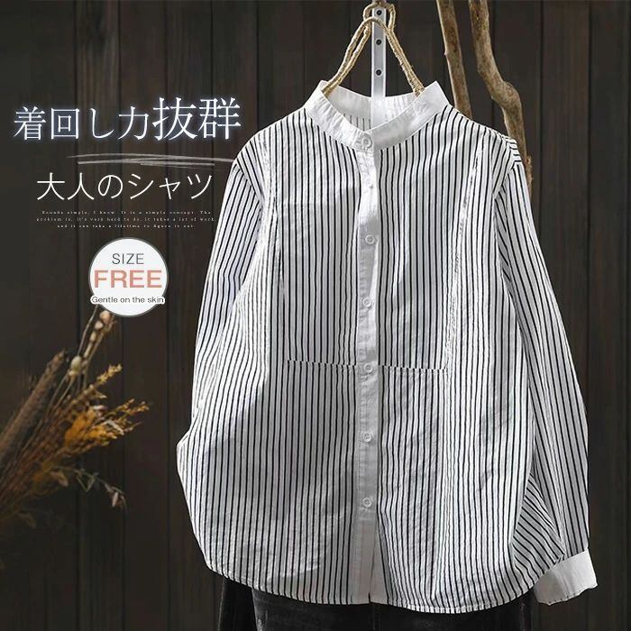シャツ 立ち襟 長袖 ブラウス レディース ストライプ柄 シャツ 綿 コットン トップス 春 秋 冬 フォーマル 大人 可愛い 森ガール おしゃれ きれいめ ゆったり 体型カバー 白シャツ OL 通勤 オフィス 着回し 入学式 卒業式 入園式 可愛い カジュアル 秋新作 送料無料 オフィス ナチュラル 定番 可愛い