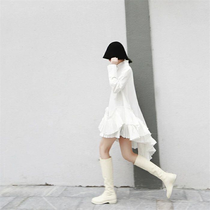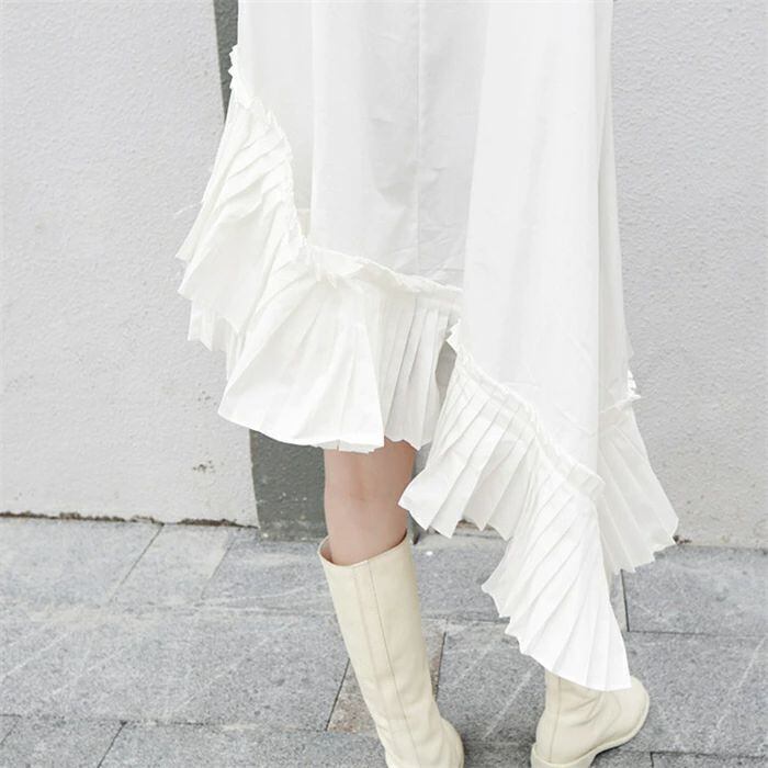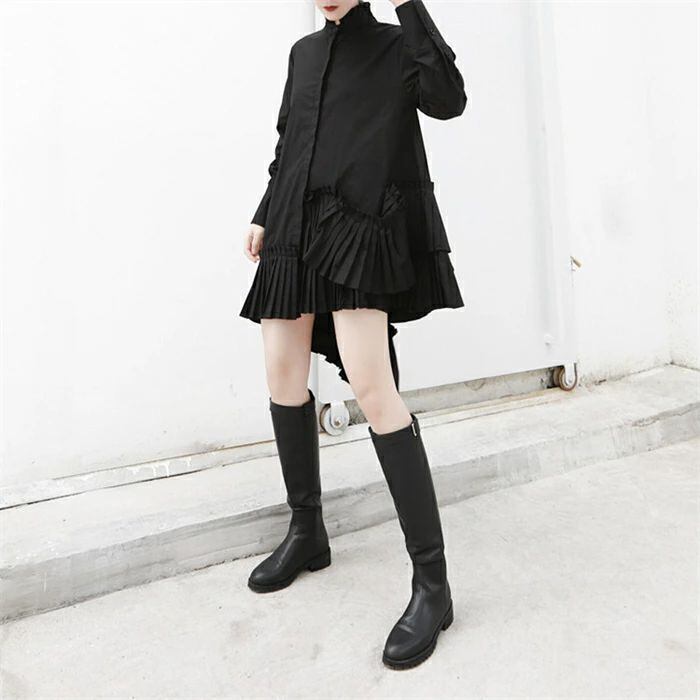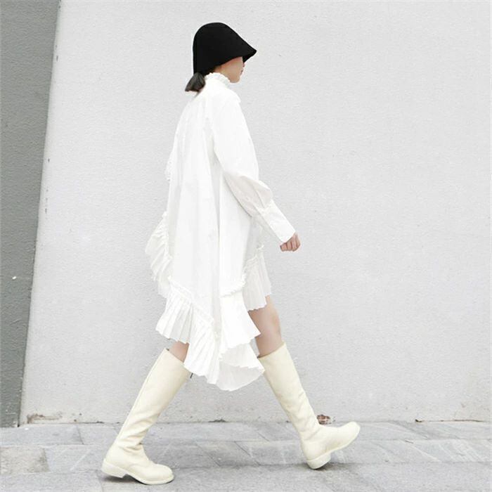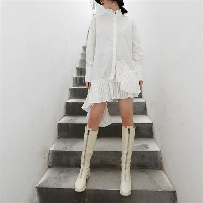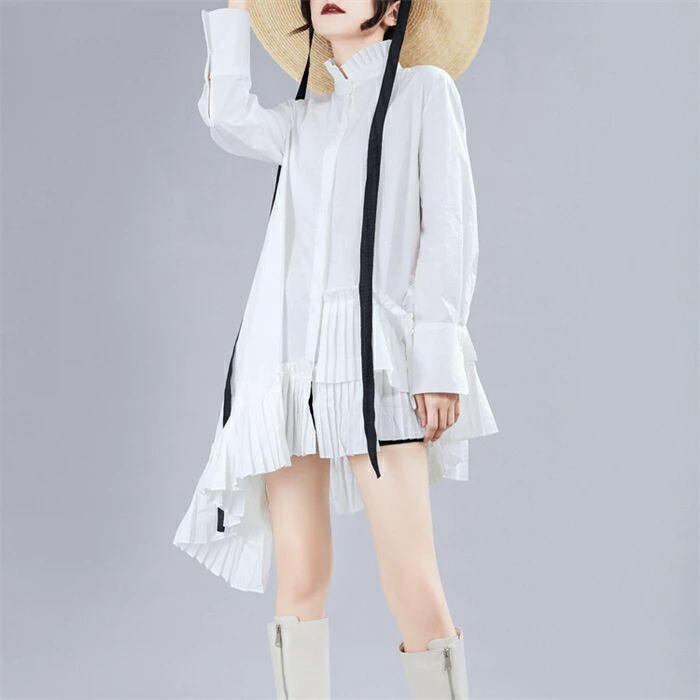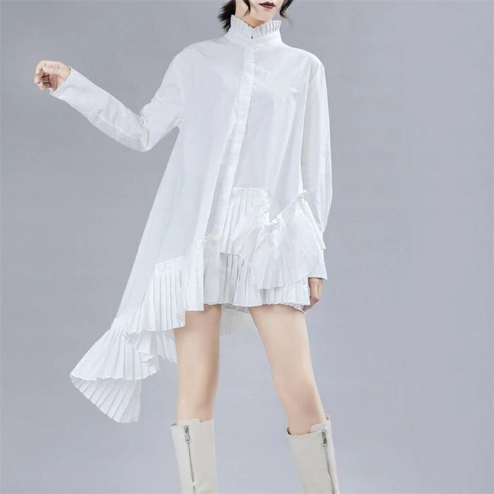 シャツブラウス レディース 春 秋 長袖 きれいめ ロングシャツ 上品 不規則 チュニック ドレス アシンメトリー 立ち襟 フリル襟 大きいサイズ 羽織り プリーツ切り替え シャツワンピース 個性的 無地 体型カバー 春秋 モード系 白 ホワイト 30代 40代 50代 送料無料