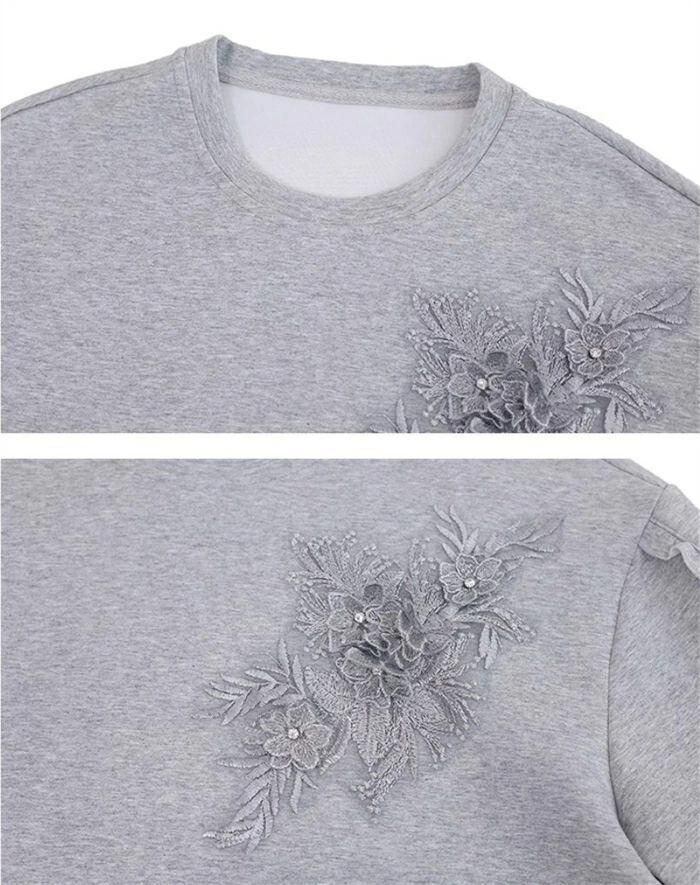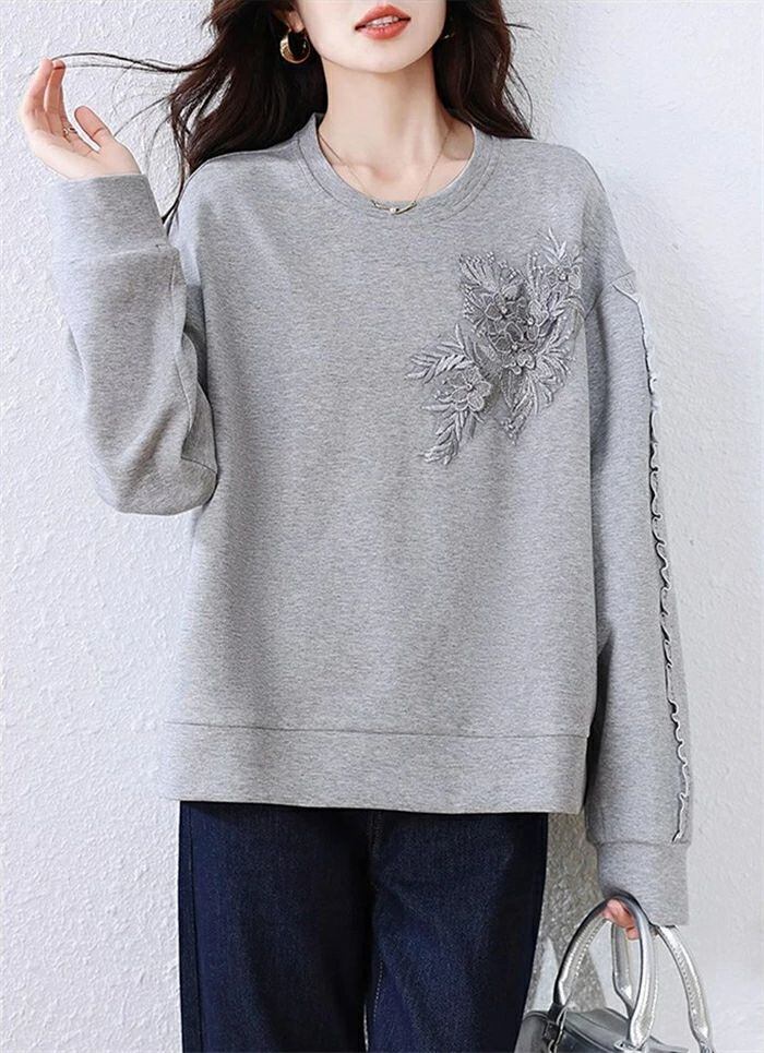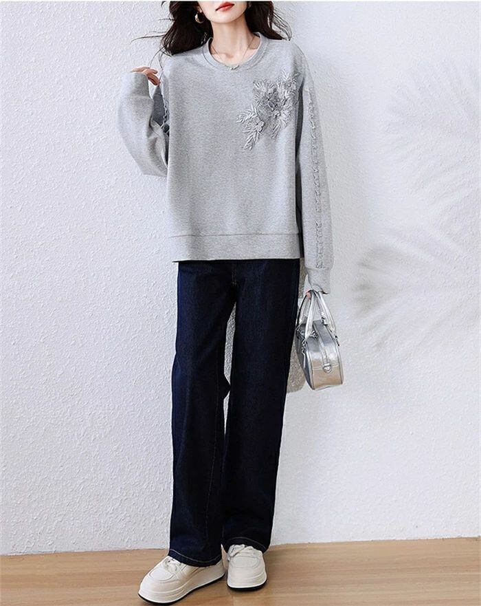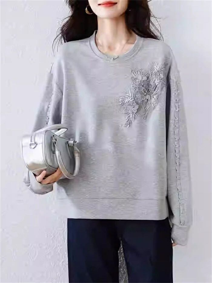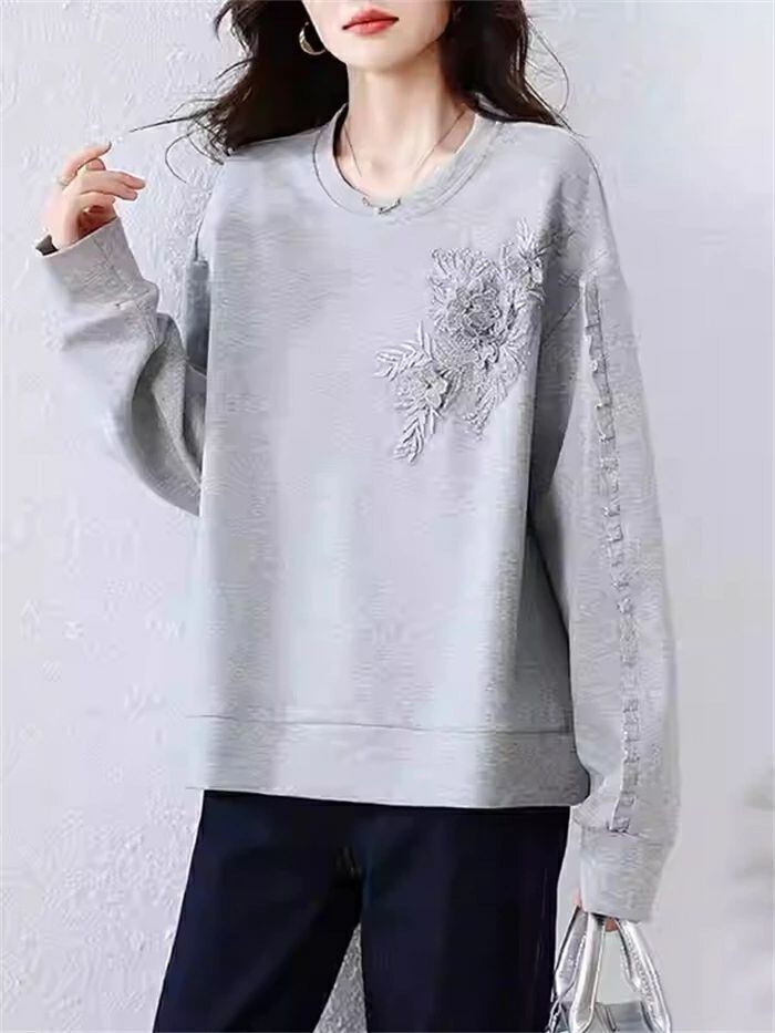 トレーナー レディース 春 秋 長袖 トレーナー クルーネック Tシャツ 無地 立体花柄刺繍 トップス トレーナー カットソー スウェット 華奢